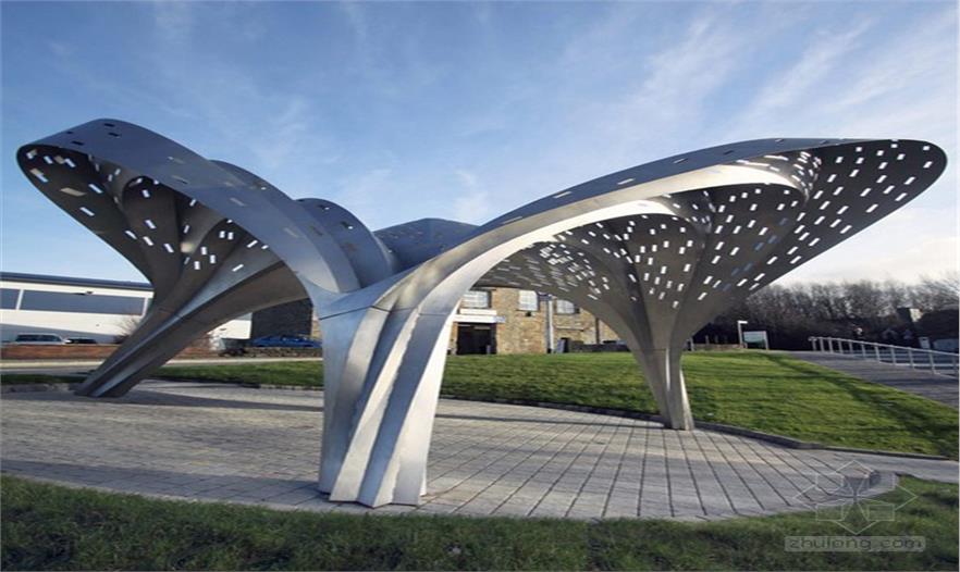 在伯恩利學(xué)院的門前、三條大路的交匯點(diǎn),這座滿是孔隙的鋼體以曲線勾勒出交通聯(lián)系的形象。雨滴的敲打聲在金屬上回響,當(dāng)雨水匯集成束從亭子上的凹槽流下時(shí),嵌入在孔隙中的透鏡將會(huì)捕捉陽光并將其打散為彩虹光譜并投影到地面上。暫且不談光譜的多彩斑駁,建筑師們與Arup公司的工程師們還倡導(dǎo)一種稱為“外殼花邊”的結(jié)構(gòu)系統(tǒng)——一種取形于自然并且通過對(duì)材料的最優(yōu)化來構(gòu)成輕量化且具有自我支持性的形式。通過整合數(shù)字制造技術(shù)和建模技術(shù),以及加強(qiáng)海洋貝殼的分層幾何層次,這個(gè)作品兼具曲線感與力量的波紋感,而這也減少了非承重層的材料使用。這使得這座亭子在擁有活力外表的情況下也具有高效的建造結(jié)構(gòu)。
