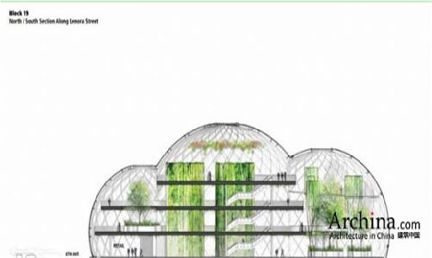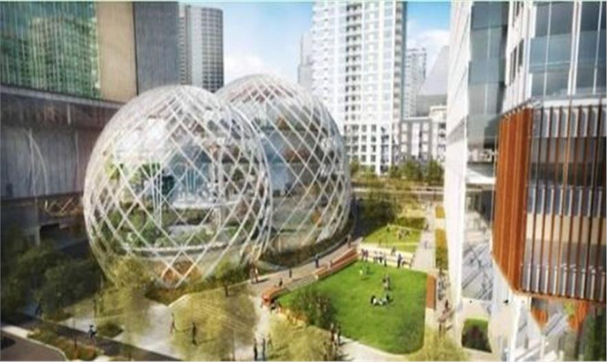 NBBJ事務(wù)所為亞馬遜公司(Amazon)總部設(shè)計了一系列“生態(tài)穹頂”(biodomes)。2012年4月,該事務(wù)所曾經(jīng)為亞馬遜公司設(shè)計過3座塔樓,高37層,地點位于西雅圖市中心。三座塔樓兩兩相對,中間是一座廣場,設(shè)置了講堂、零售店和公共開放空間等。