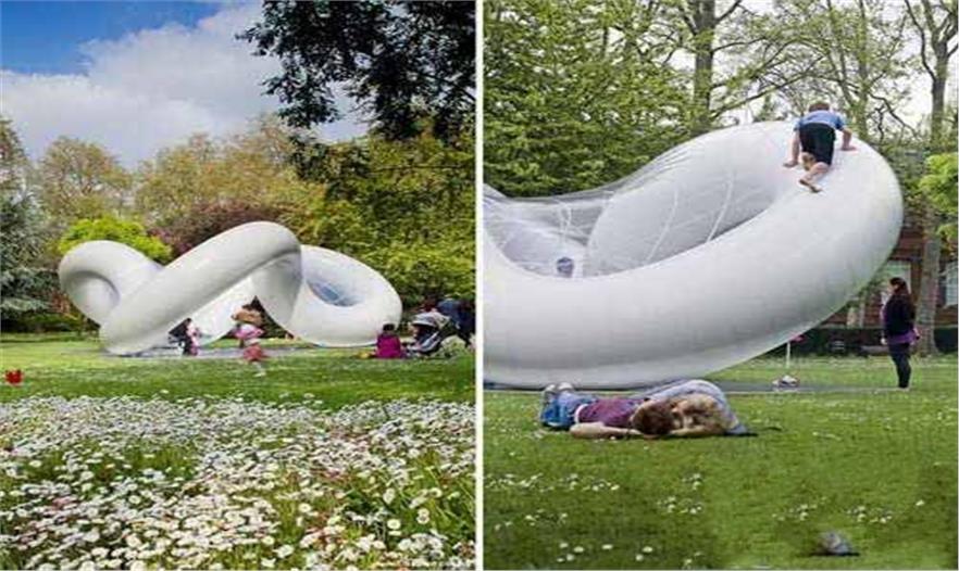 和平館是一個由彎曲纏繞的充氣聚氯乙烯管組成的結(jié)構(gòu),營造出代表和平理想的動態(tài)曲面造型。和平館設(shè)計體現(xiàn)了“和諧、純凈、歡樂、安寧、冷靜、和解、新奇、通透”的設(shè)計理念。和平館雙曲面外層覆蓋了透明膜結(jié)構(gòu),營造出供兒童攀爬、成人休憩的4米高的有趣空間。