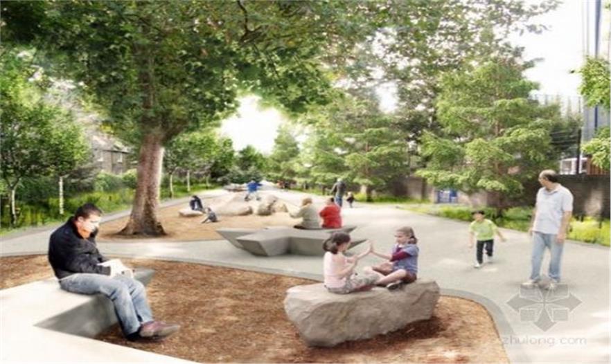 現(xiàn)有的社區(qū)缺乏休閑玩耍的必需品、自然開放空間和低樹覆蓋,未充分利用的房地產(chǎn)花園將被納入公共領(lǐng)域并豐富為生產(chǎn)花園、游樂空間、雨水花園和綠色基礎(chǔ)設(shè)施。一個新的綠色走廊由南向北通過社區(qū)來連接和加強(qiáng)現(xiàn)有的口袋公園并吸引居民,學(xué)校通過非正式的游戲和一個種有水果和蔬菜的“食用景觀”花園。設(shè)計(jì)師在教堂街加入了改進(jìn)后的公民街和廣場,并連接新的公共建筑,如大學(xué)、健康中心、圖書館和市場。在公民街的十字路口設(shè)置的新的市政廣場和綠色走廊成為社區(qū)活動和節(jié)日的市場焦點(diǎn)。實(shí)施階段的基礎(chǔ)設(shè)施和公共領(lǐng)域的計(jì)劃估計(jì)要1.6-1.8千萬歐元的預(yù)算和5年時間才能完成。