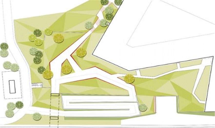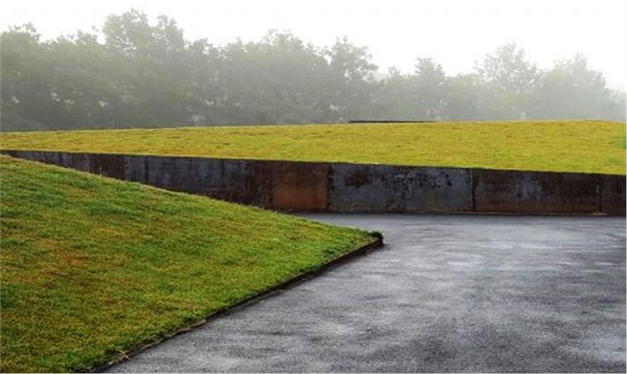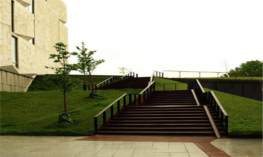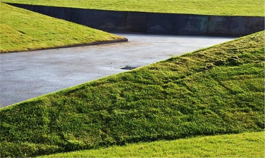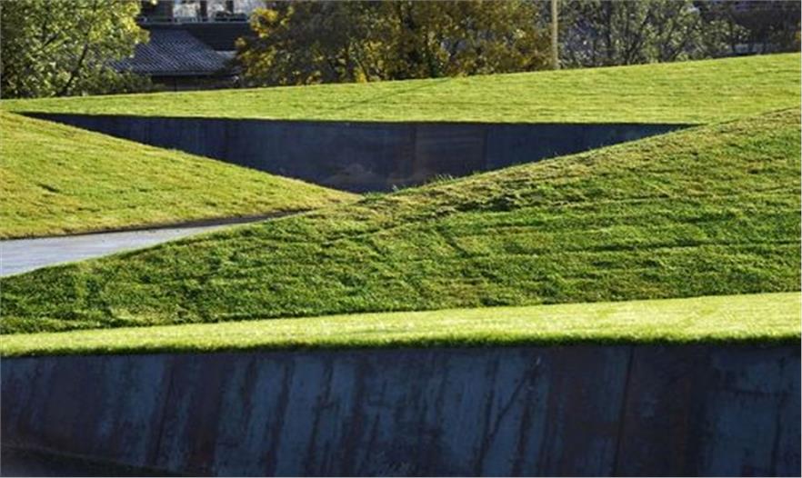 精確的三角草坡形成了一個低金字塔形狀,這個形狀猶如屋頂公園的面積區(qū)域地帶,而這種設(shè)計又恰如其分地補充了外墻的設(shè)計邊緣,并同時構(gòu)成過渡到東部街道的石級。銀杏樹補給斜坡和頂部的草被景觀,如落葉松,柞木,櫻花等。