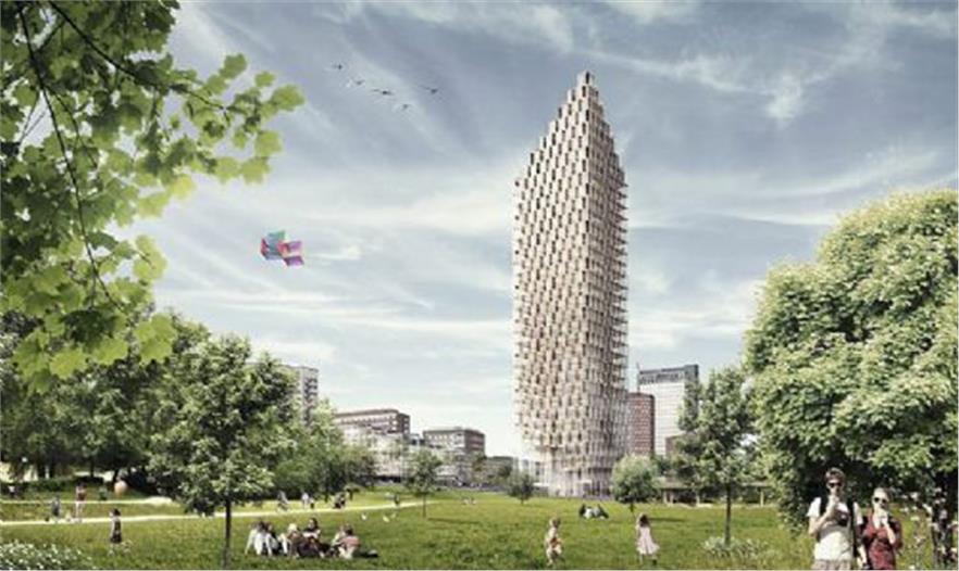 C.F.Moller為HSB斯德哥爾摩競(jìng)賽描述的宏偉畫卷設(shè)計(jì)了一座太陽(yáng)能供電的木制摩天大樓。HSB是瑞典最大的房產(chǎn)商,因此在該公司即將于2023年慶祝其創(chuàng)立100周年之際,更有資格提出“瑞典的住宅的現(xiàn)狀和未來(lái)應(yīng)該怎樣”這樣的問(wèn)題。該競(jìng)賽征集一種智能住房設(shè)計(jì),既能創(chuàng)建一座未來(lái)的住宅建筑又能提出一個(gè)高密度可持續(xù)居住環(huán)境的解決方案。C.F.Moller的設(shè)計(jì)旨在積極利用木材的最佳品質(zhì),為斯德哥爾摩建設(shè)一座34層的摩天大樓,也為城市樹(shù)立一座燈塔。它不僅是一個(gè)單純的標(biāo)志景觀,還因其街道咖啡館、社區(qū)中心、市場(chǎng)及城市花園等成為一個(gè)城市休閑娛樂(lè)會(huì)面場(chǎng)所。該方案精心設(shè)計(jì)了私人住宅,低碳節(jié)能,玻璃陽(yáng)臺(tái)簡(jiǎn)潔大方,加入了大片不同紋理的木材。該建筑會(huì)有一個(gè)混凝土核心,但使用了平面木材,讓居民有自己的私人花園。