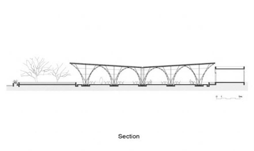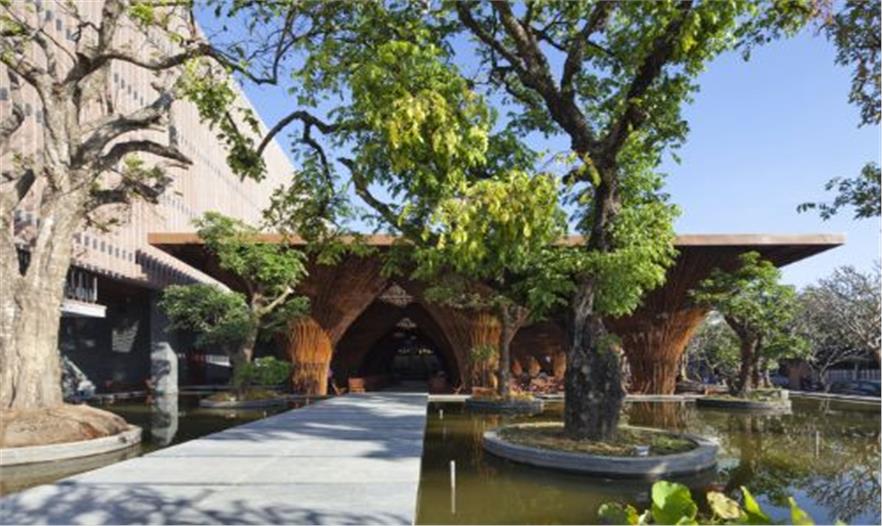 設(shè)計(jì)的靈感來自越南傳統(tǒng)的捕魚用的竹筐,屋頂采用茅草和增強(qiáng)纖維材料編制而成,光線可以很容易地透過,灑入餐廳內(nèi),形成斑駁的光影效果。用餐者的餐桌位于“竹傘”下,猶如置身于水邊竹林之中。Kontum Indochine Cafe沒有任何墻的包圍,可以將周圍水景與遠(yuǎn)處的山色一覽無余。餐廳內(nèi)沒有設(shè)置空調(diào),設(shè)計(jì)師解釋道,通過周圍的水池和樹蔭,即使在最熱的季節(jié)這里也感覺涼爽舒適。