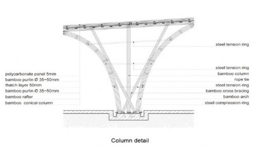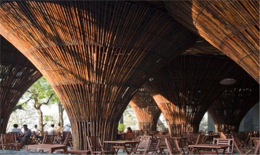 Kontum Indochine Cafe位于越南Kontum Indochine Hotel酒店內(nèi),設(shè)計(jì)來自Vo Trong Nghia Architects。五排竹子構(gòu)建成的大傘樣的柱子支撐著這座水邊咖啡廳的屋頂。