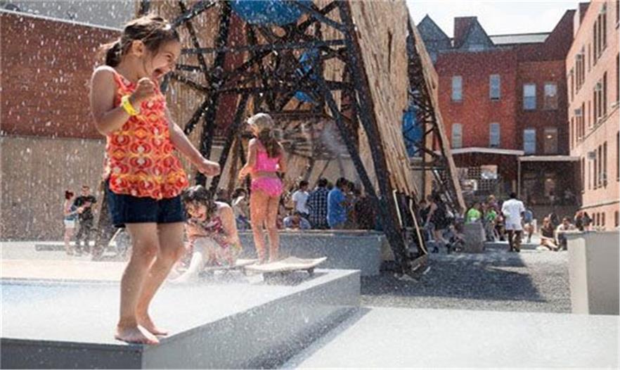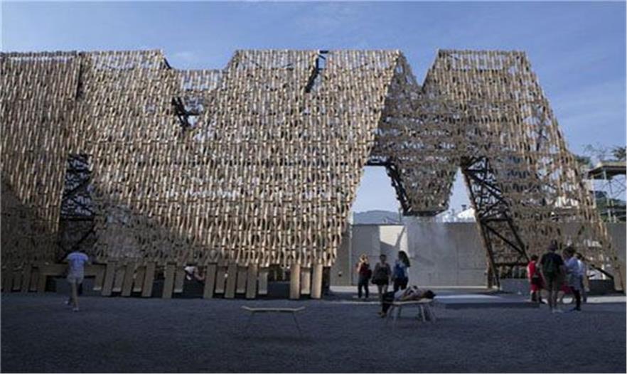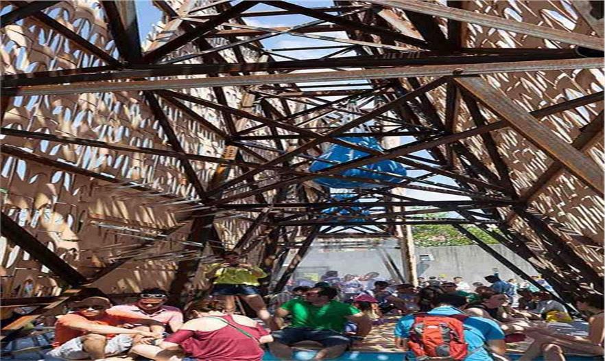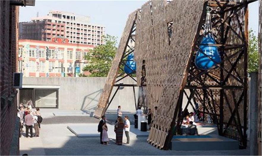 “滑板碎片”幕墻亮相2013年美國現(xiàn)代藝術(shù)博物館音樂節(jié),并成為最大的關(guān)注對象。整面幕墻都是由滑板木片殘余構(gòu)成,呈空隙狀分布的幕墻非常適合音樂節(jié)這樣的靈動性場所,因為這里聚集著大量的流動游客,這里通常會設(shè)有可拆卸的木質(zhì)桌椅已經(jīng)為行人提供遮蔭避暑的小型廣場。