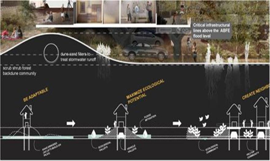 ELandScript一直致力于將規(guī)劃設(shè)計(jì)與時(shí)代熱點(diǎn)問題相連,本競賽項(xiàng)目旨在回應(yīng)2012年襲擊美國的颶風(fēng)桑迪的遺留問題,作為規(guī)劃設(shè)計(jì)者,我們對這片災(zāi)后的土地提出了一套可持續(xù)發(fā)展的災(zāi)后規(guī)劃戰(zhàn)略,主要包括可持續(xù)發(fā)展(Sustainability)、可教育性(Education),、連接性(Connectivity),、獨(dú)特性(Unique) 和防災(zāi)性(Resillience)。
