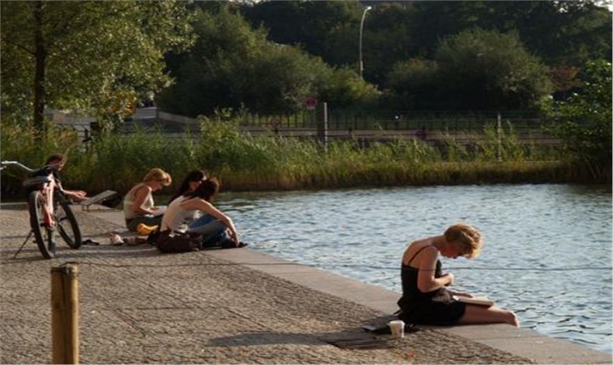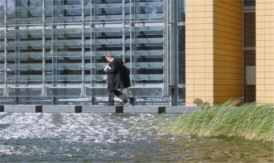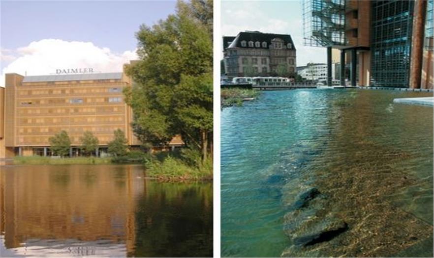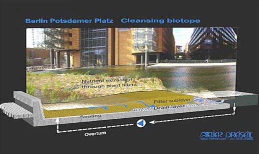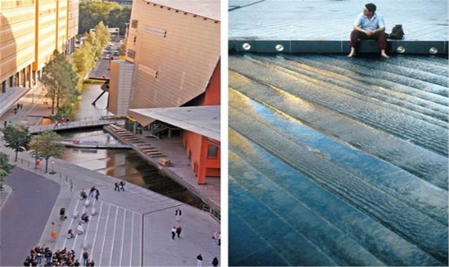 這一城市水景設計之中蘊含的理念即為,雨水在降落之地即應被就地使用。在波茨坦廣場,綠化屋頂和非綠化屋頂?shù)慕Y(jié)合設計可以獲取全年降雨量。雨水從建筑屋頂流下,作為沖廁、灌溉和消防用水。過量的雨水則可以流入戶外水景的水池和水渠之中,為城市生活增色添彩。