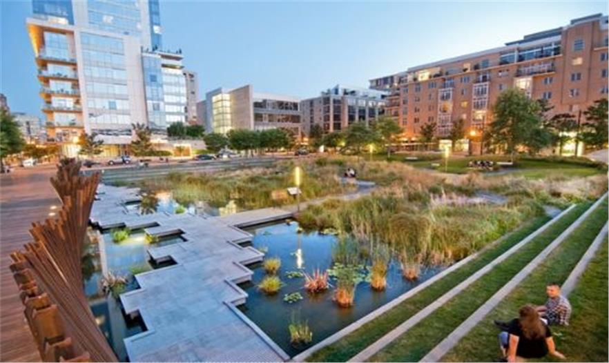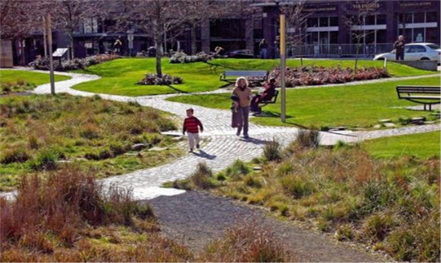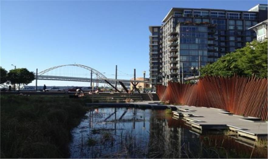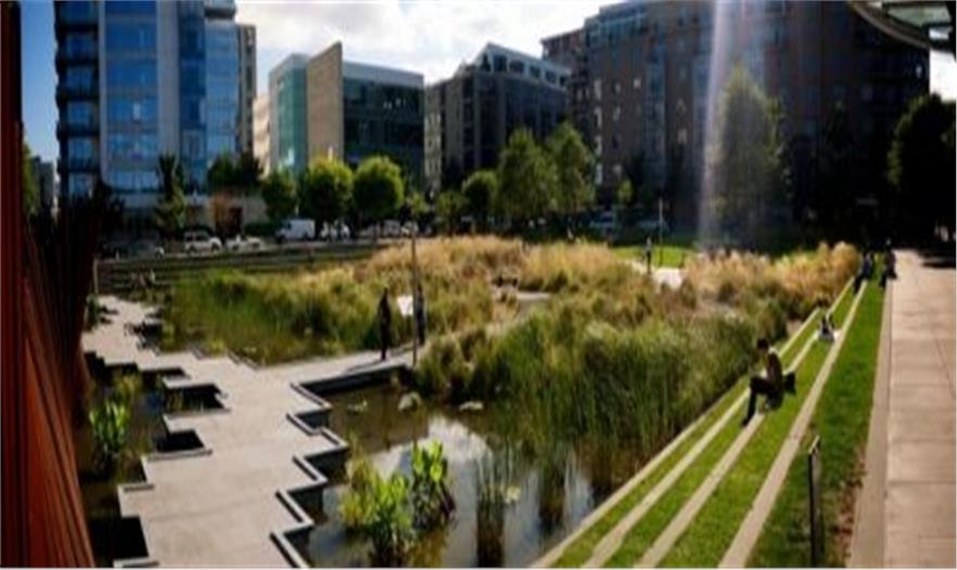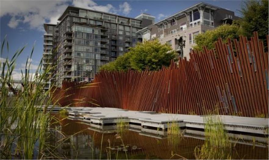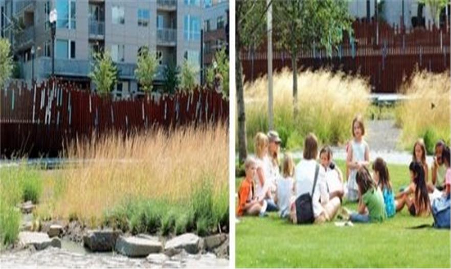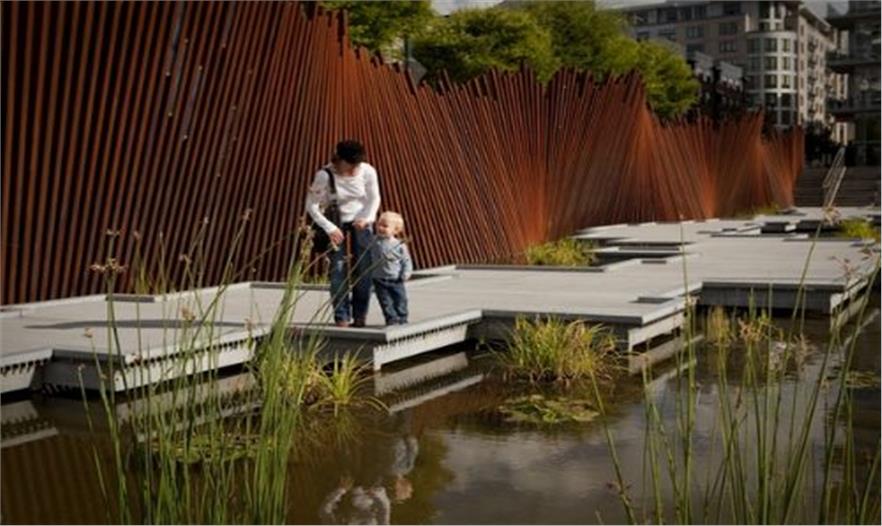 戴水道設(shè)計(jì)公司的創(chuàng)始人赫伯特·德萊塞特爾先生本人通過手繪,將這里曾經(jīng)生存的生物圖案繪制于熱熔玻璃上,并鑲嵌在“藝術(shù)墻”內(nèi)。在這個繁華的市中心地帶,生態(tài)系統(tǒng)得到了恢復(fù),人們居然可以看到魚鷹潛入水中捕魚。在甲板舞臺上可以盡情地表演各種文藝活動,孩子們來到這里玩耍、探索自然奧秘,而另外一些人們則可以在這片自然的優(yōu)美秘境中充分享受大自然芬芳、進(jìn)行無限的冥想。深入的社區(qū)參與和地產(chǎn)調(diào)查顯示,這個公園是當(dāng)?shù)厝藗儗?shí)現(xiàn)夢想和希望的地方。