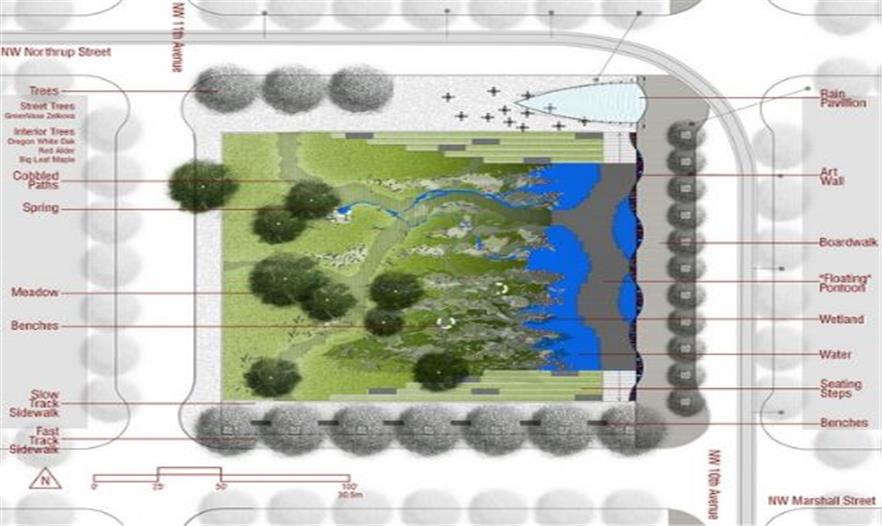 波特蘭珍珠區(qū)基址原為一片清泉滋潤的濕地,被坦納河(Tanner Creek)從中劃分開來,與寬廣的威拉麥狄河(Willamette River)相鄰。鐵路站和工業(yè)區(qū)首先占用了這片土地,并伴有場地排水要求。