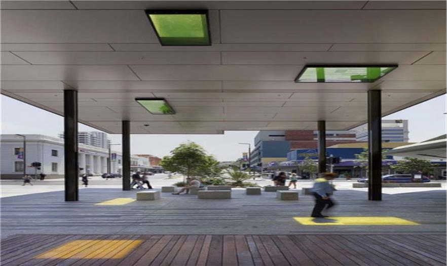 城市規(guī)劃局并不僅僅是要將其作為一個(gè)交通樞紐中轉(zhuǎn)站,而是想建立一個(gè)步行廣場。為此,建筑師在此區(qū)域建立了一個(gè)平行于街區(qū)的線性場館區(qū)域,這里設(shè)有劇院、咨詢臺、咖啡廳以及一些娛樂設(shè)施,經(jīng)過此處的游客可以享受一些休閑時(shí)光。建筑師期望通過一樣的一種設(shè)計(jì),可以將行人與城市交通有機(jī)、和諧的聯(lián)系起來。這樣一來,此區(qū)域的人們既可以感受當(dāng)?shù)胤睒s的經(jīng)濟(jì)發(fā)展,同時(shí)也可以感受到這一城市的歷史文化變遷,城市的多面形象在這里得到了最好的體現(xiàn)。廣場中采用了一系列可以彰顯當(dāng)?shù)貧v史特色的建筑元素——高角結(jié)構(gòu)、庇護(hù)遮蔭棚、柔和的燈光和相關(guān)的裝飾性材料的的運(yùn)用。為了滿足當(dāng)?shù)厝藗兊母鞣N休閑娛樂需求,這一區(qū)域還特意增設(shè)了周末集市、戶外電影節(jié)和一些社團(tuán)活動等。