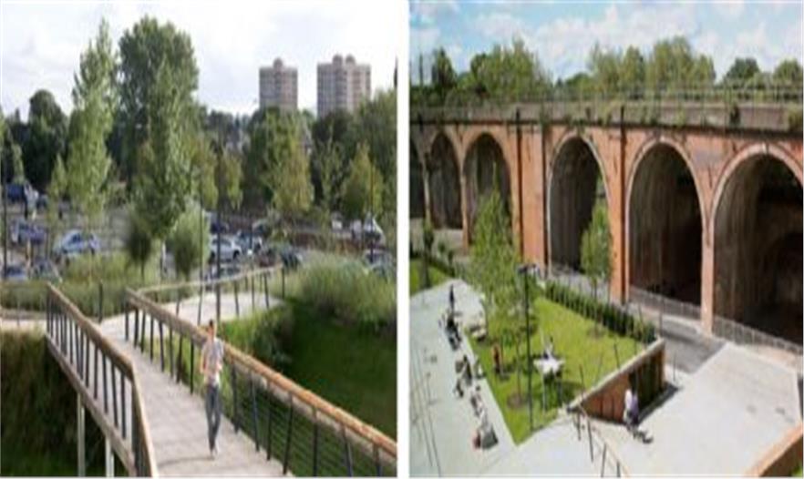 精心布置的景觀自然環(huán)境中鳥語花香。景觀各要素間以及與周邊環(huán)境都十分和諧。 遠處有拱洞的構筑物是高架鐵道。