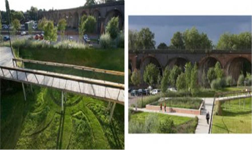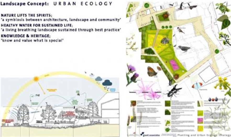 兩公頃的占地中布置了兩個盆地,盆地中隆起系列島嶼。潮濕的草甸和水灣蜿蜒其間。重 點包括: 水草甸:野花水草甸是主要的景觀形式和環(huán)境教育案例。其低維護,能夠處理季節(jié)性范 洪。植物品種包括蓮香報春花(黃花九輪草),蘭花,川貝,鳶尾??沙掷m(xù)排水系統(tǒng):水 草甸可以滯留附近的城市雨水排水,對其過濾;持續(xù)島嶼:水草甸上有兩個生態(tài)島嶼,其 中一個通過橋梁與兒童圖書館聯(lián)系,讓孩子們可以熟悉大自然,感受大自然的奧秘,植 物,動物。
