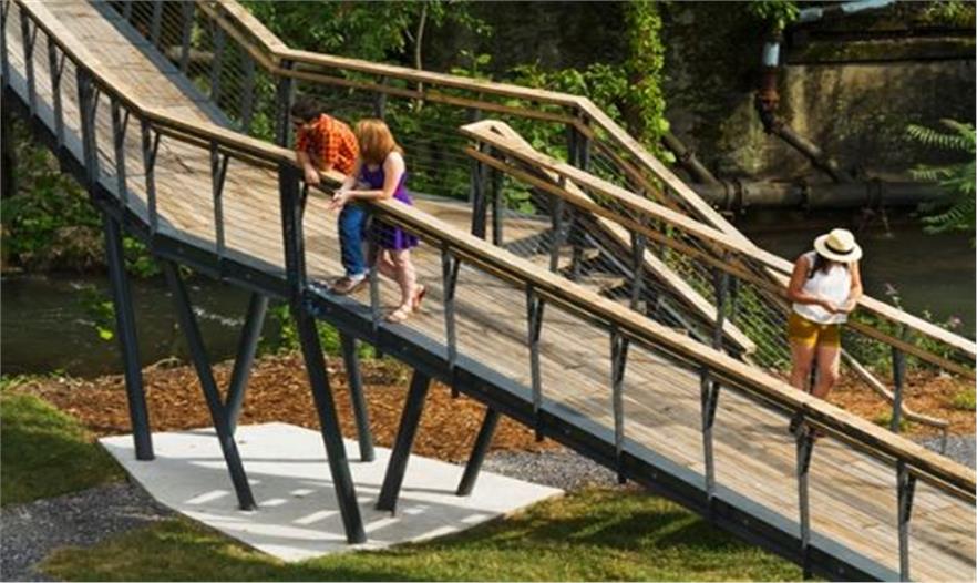 這個項目位于經(jīng)濟拮據(jù)的弗吉尼亞州福吉克利夫頓鐵路鎮(zhèn),該鎮(zhèn)曾經(jīng)因工業(yè)制造而繁榮,如今后工業(yè)化時代,小鎮(zhèn)面臨著城市更新和復(fù)興。這個冷清的地方被改造和復(fù)興,并在重建后的小鎮(zhèn)中心提供急需的公共空間,這座小橋便是重整計劃中的一個振興元素。