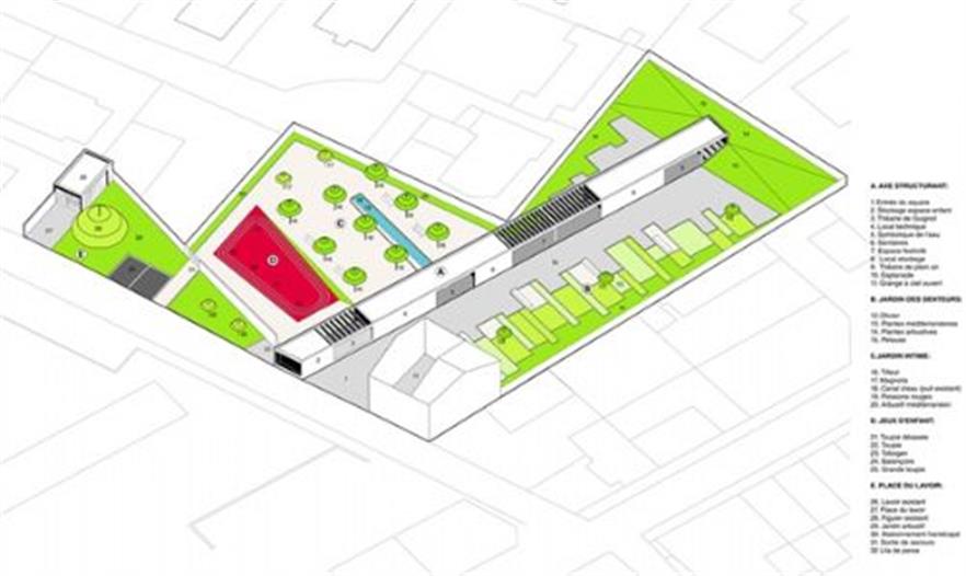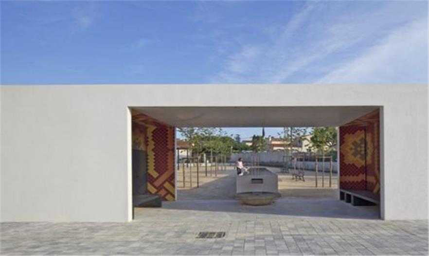 70米的構(gòu)筑物內(nèi)部某些地方被掏空,不阻隔廣場(chǎng)兩側(cè)的聯(lián)系。廣場(chǎng)的入口處為翻新的谷倉,往內(nèi)走,構(gòu)筑物一則有茂盛的普羅斯旺植物鮮花池。兒童區(qū)在靠近入口的位置,小劇場(chǎng),游樂場(chǎng),噴泉,露天聚餐處,露天電影院等公共功能后續(xù)展開。軸線構(gòu)筑物的內(nèi)切面用現(xiàn)代手法演繹了濃濃當(dāng)?shù)仫L(fēng)格的普羅斯旺彩色陶瓷圖案。