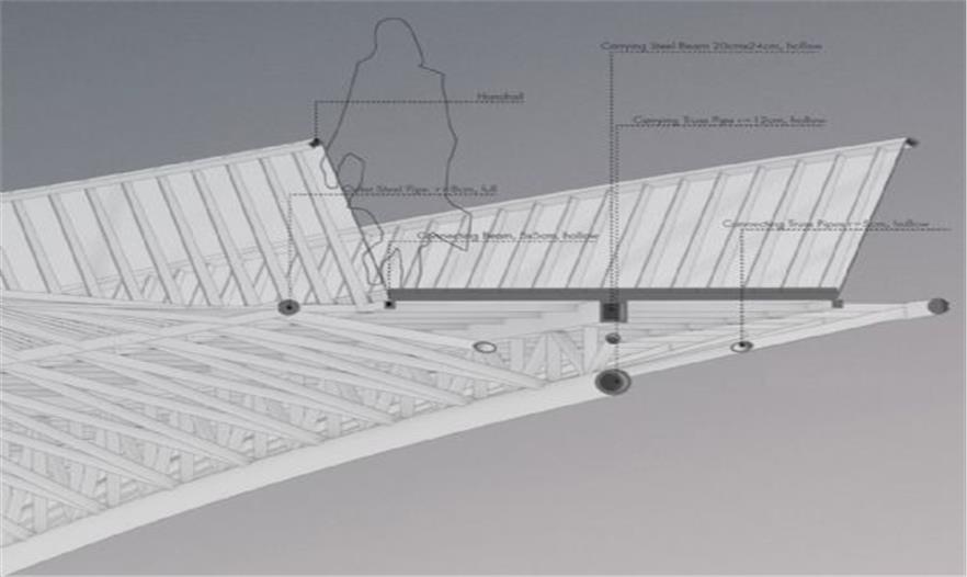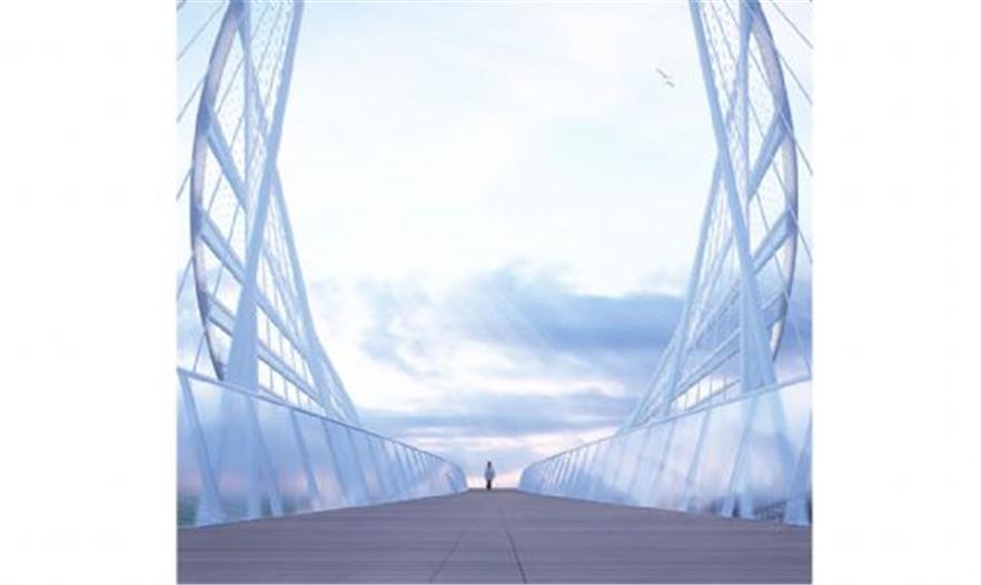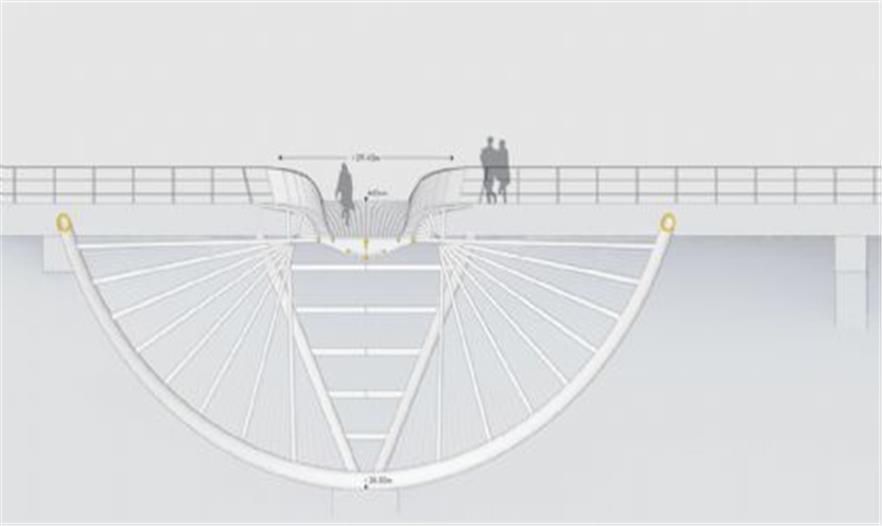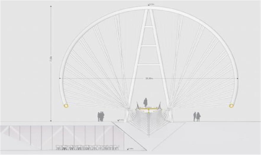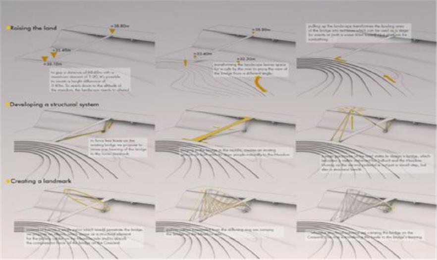 橋面鋪上木甲板,欄板為半透明同時輕微向外側(cè)傾斜,呈開放歡迎的姿態(tài)迎接過往人 群。橋體上那引人注目的鋼環(huán)由異型鋼管焊接而成,鋼索牽引著鋼環(huán),最后將力傳遞 到河道高坡上的混凝土基礎(chǔ)之上,減輕了橋體在兩岸的落腳荷載。夜晚,LED燈照亮 了橋體,這座橋是一個優(yōu)雅的元素,它全天候的融入這片土地,為當(dāng)?shù)剡€有附近的人 們帶來不一樣的意義和印象。