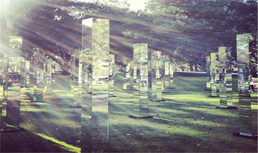 新西蘭的建筑師團(tuán)隊(duì)Out of the Dark 將一組八十一根四方鏡面立柱,也就是423面鏡子,裝置在悉尼海德公園的開闊綠地上,作為一座公共藝術(shù)項(xiàng)目,名為“Field” ,是藝術(shù)家們對(duì)視覺本質(zhì)的一種思考。參觀者倘徉其中,也會(huì)對(duì)真實(shí)與幻象產(chǎn)生思索。