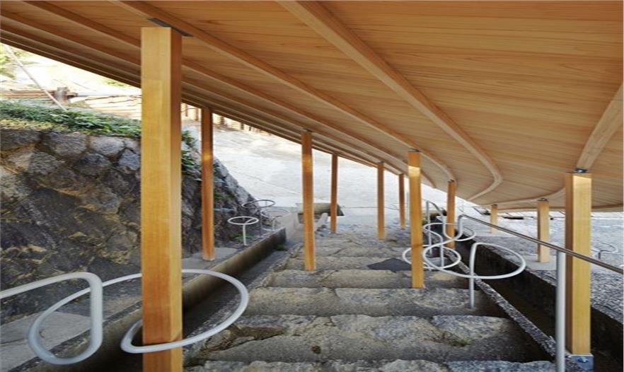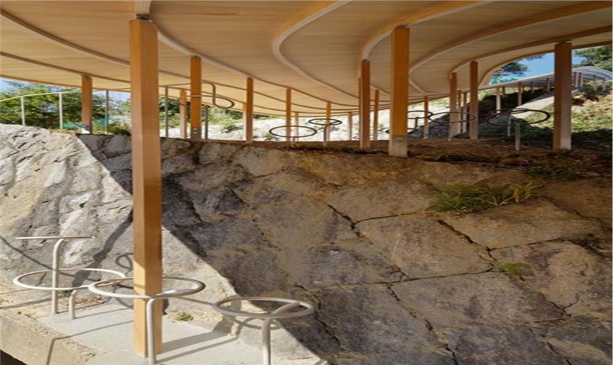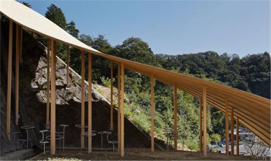 屋頂精巧的依據(jù)地勢傾斜,仿佛向下流動的溪水。既是屋頂又像一道“屏障”,roof and mashrooms 的空間體驗(yàn)就是要喚起游客漫步在山間茂盛樹冠之下的感覺。