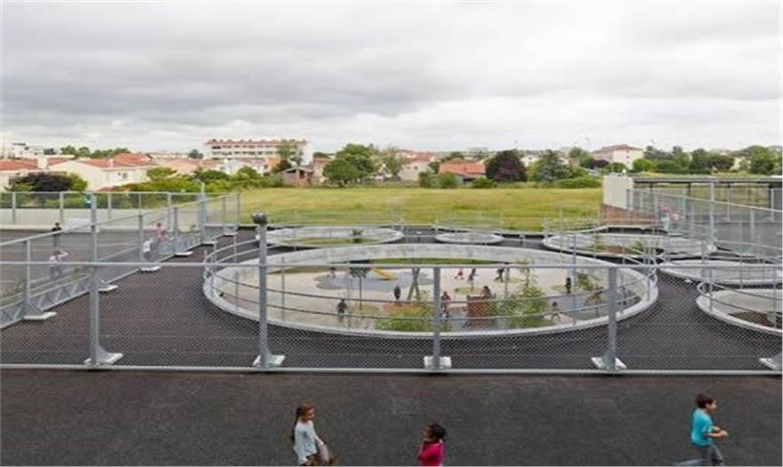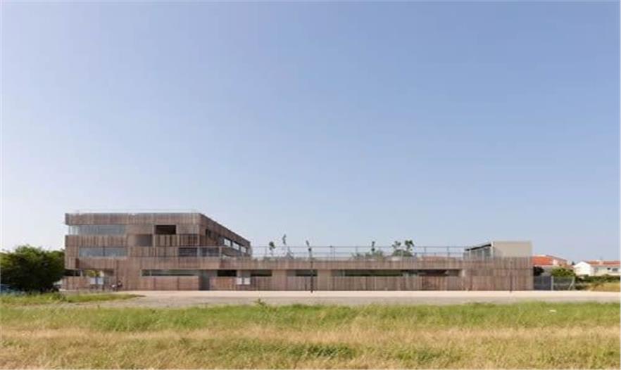 該小巧的教育綜合體包括:覆蓋整個基地的保育園。很大空洞的屋頂。小學,細長的體量,屋頂是活動場。穿過屋頂?shù)臉淠?,在空間上連接校園的活動場。不連續(xù)的木材的建筑表皮有點像彩色鉛筆,它可以防止窗戶被過度日曬,并給運動場遮陽。