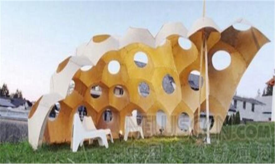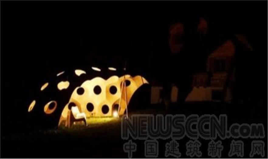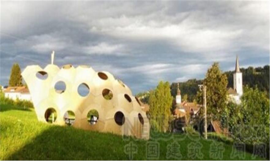 該項目的成本只有1500歐元,呈雙弧形,開放式結(jié)構(gòu),由30個6.5 毫米厚的預(yù)制膠合板片單弧和1500個螺栓組成,被建造在奧地利的一座山坡上。亭子的有機形狀類似海膽的結(jié)構(gòu),其杰出的骨架和結(jié)構(gòu)近年來啟發(fā)了無數(shù)參數(shù)化設(shè)計方案。在這個木制亭子中,蜂窩狀的海膽骨骼結(jié)構(gòu)被轉(zhuǎn)化為由30個D形狀圓開口組成的泰森多邊形圖案,然后縱橫交錯,鑄就了最終的設(shè)計——長7米、寬5米、高2.6米的木制輕質(zhì)結(jié)構(gòu)。亭子的開口框住了阿爾貝施文德區(qū)域的美景。到了夜晚,室內(nèi)的燈光照亮了整個亭子,突出了結(jié)構(gòu)的多孔性和復(fù)雜的建筑結(jié)構(gòu)。