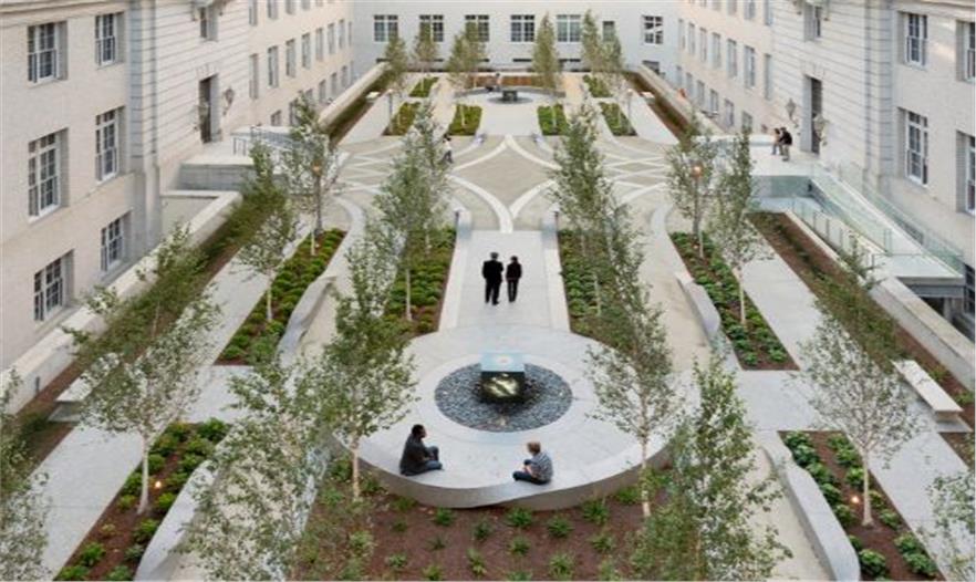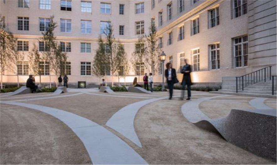 這些雕塑,制成再生和現(xiàn)澆混凝土,給人的印象是水平面已取消,創(chuàng)建一個三維交織的形式和庭院內(nèi)循環(huán)體系建立休息點。院子的綠色特性是基于簡單的可持續(xù)的技術(shù),具有低水,耐蔭的特點,栽下32棵白樺樹,在活躍的地面和建筑物的白色磚墻之間創(chuàng)建垂直維度。Ribbons在歷史建筑保護與GSA設(shè)計的聯(lián)邦大廈方案之間以敏感線隔開,其激進的可持續(xù)性倡議項目在GSA的卓越的設(shè)計程序。