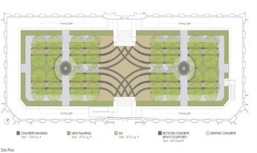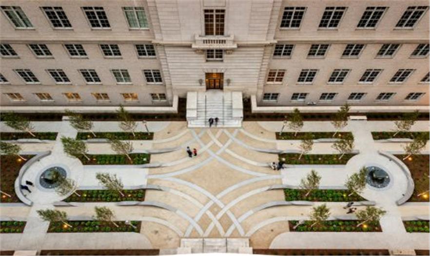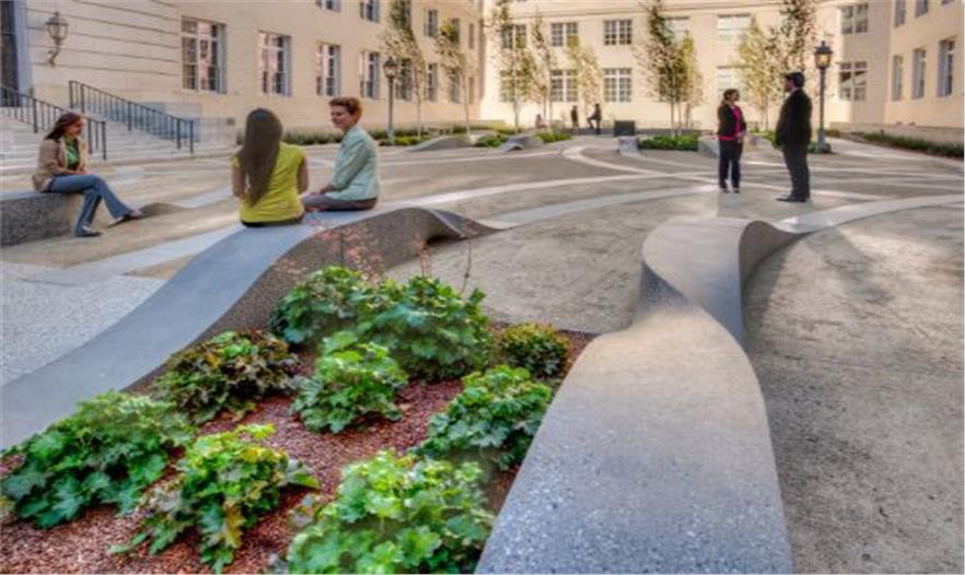 Garten重新設(shè)想了Arthur Brown的1932年計劃的兩個經(jīng)典的噴泉(這是從來沒有建立)作為當代花崗巖的形式。這些形式是一個較大的水平詞匯的細長的經(jīng)典主題的一部分,混凝土攤鋪帶設(shè)置成一個較大的透水表面部分分解花崗巖。優(yōu)雅的現(xiàn)澆混凝土長椅上升,扭轉(zhuǎn)和回到這些鋪帶給人一種節(jié)奏間斷循環(huán)系統(tǒng)在庭院里。