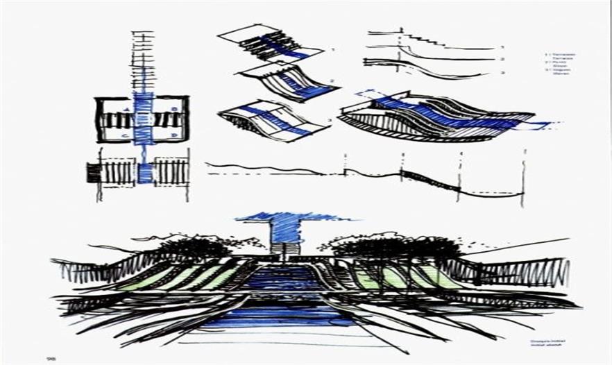 在充滿了現(xiàn)代主義景觀設計和雕塑作品的拉德芳斯區(qū),狄德羅公園深陷在超現(xiàn)代的玻璃塔樓中猶如一顆翡翠明珠,它以汲取自古典園林的阿蘭·普羅沃斯風格結(jié)合水的美學,成為了拉德芳斯區(qū)獨特的一景。狄德羅公園是普羅沃斯中后期的作品,這一時期的普羅沃斯已經(jīng)不再偏愛自然有機的形式,而是從幾何形式中探求現(xiàn)代設計的語言。狄德羅公園的設計就表現(xiàn)出了愛到勒·諾特爾式園林空間布局的影響。
