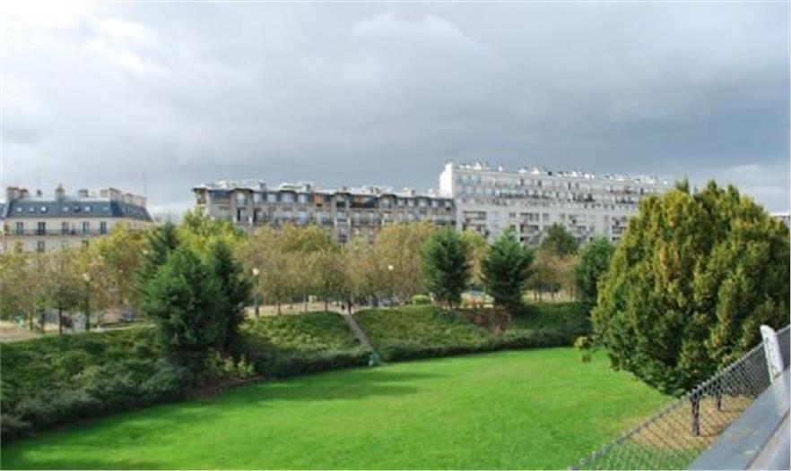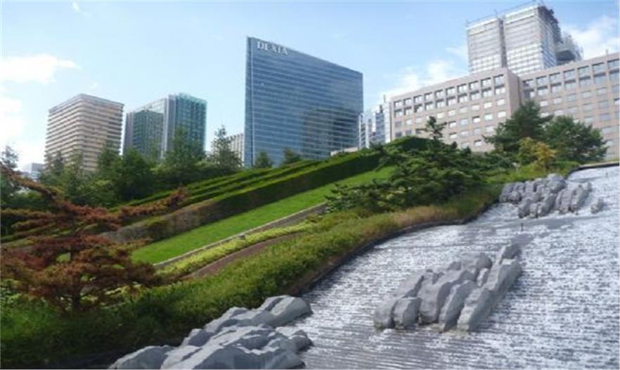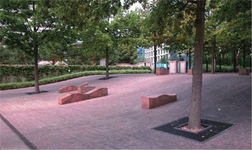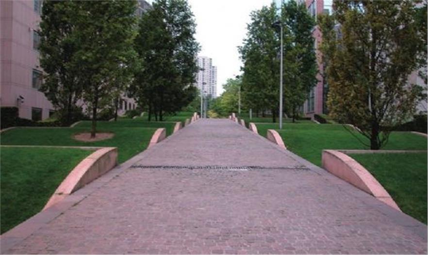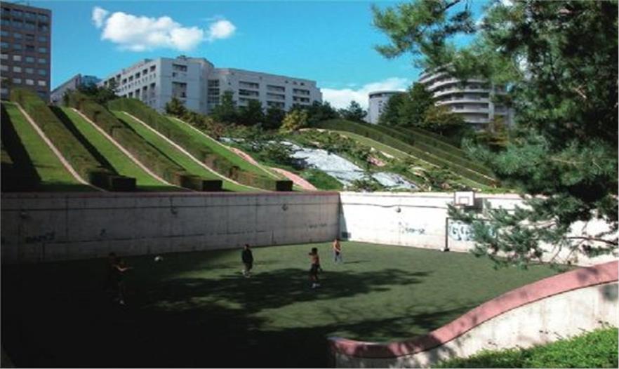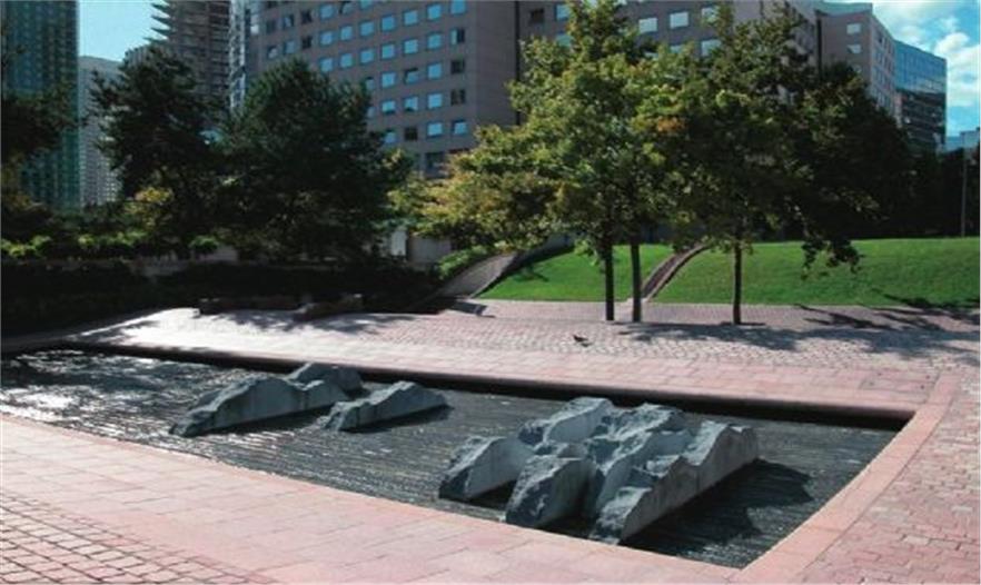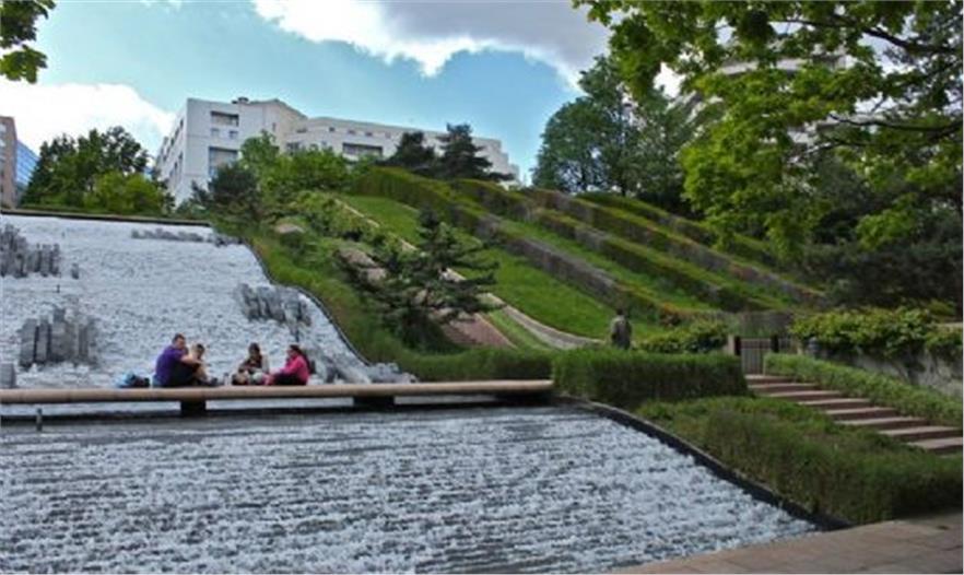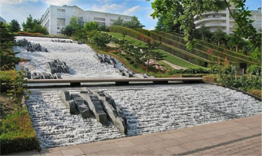 狄德羅公園占地1.5公頃,建成于1993年,這一時期普羅德沃的風格已經(jīng)成熟。公園分為三部分:Vosges廣場、狄德羅步行道和公園。水和波浪形構(gòu)成了這一序列的主題。公園的四個角落是不同的場地,兩個位于坡頂,兩個位于坡底,形成相對獨立的小空間,每個空間都有自己的主題和風格,有不同的使用功能,如兒童游戲場、修剪植物花園等。夏德海爾瀑布是公園景觀的核心,瀑布位于花園中部,是一個利用12米的高差形成的巨大跌水,水坡面上有不規(guī)則分布的巖石組,打破了對稱的布局,并濺起銀色的水花。斜坡兩側(cè)各有幾條平行的紫杉籬,隨著草地一起波動,點綴了斜坡。水池邊種植了品種繁多的低矮植物,葉子的質(zhì)地和色彩變化豐富。狄德羅公園因水與波浪形的和諧統(tǒng)一而在拉德芳斯區(qū)玻璃和混凝土的世界里別樹一幟,但是在考察團參觀的時候,卻因養(yǎng)護不當而水池干涸,雖然跌水水池中造型獨特的巖石仍然不失為一道風景,但這一情況卻提醒我們水景園的設計要考慮到后期的養(yǎng)護工作,包括資源的節(jié)約和養(yǎng)護費用的高低。