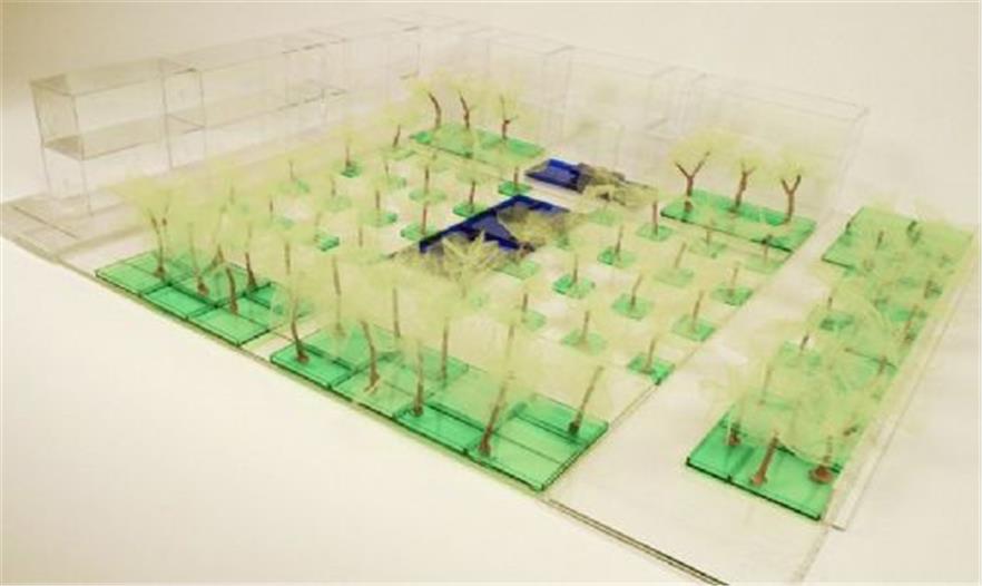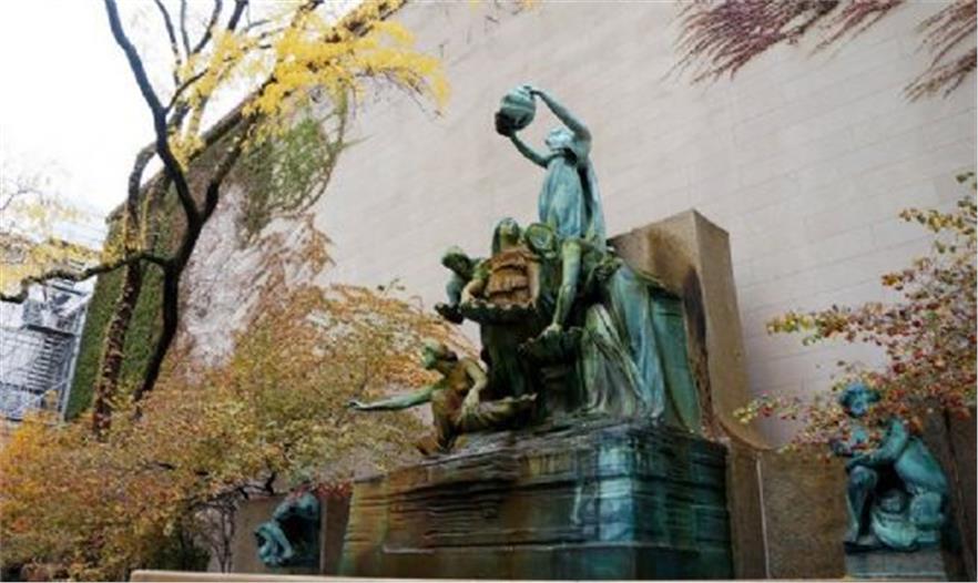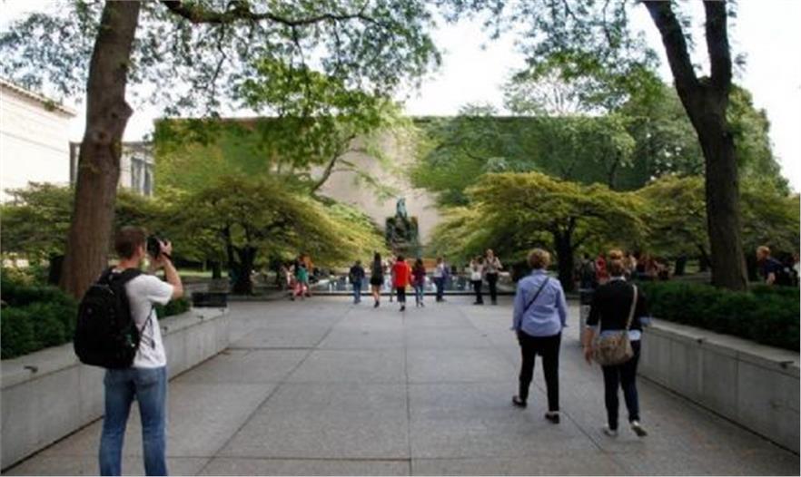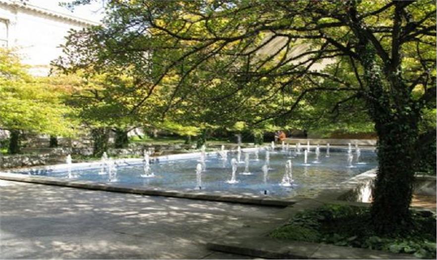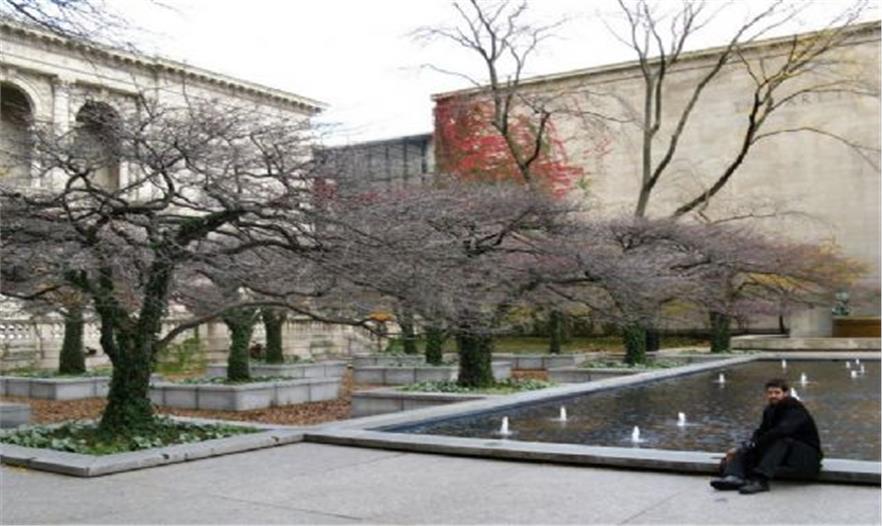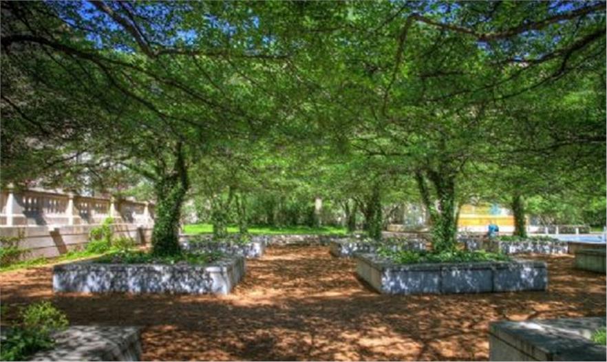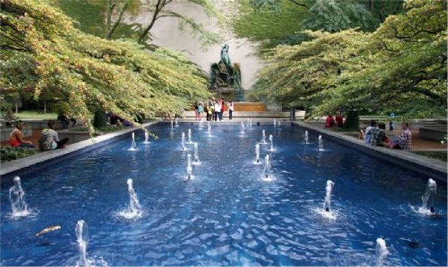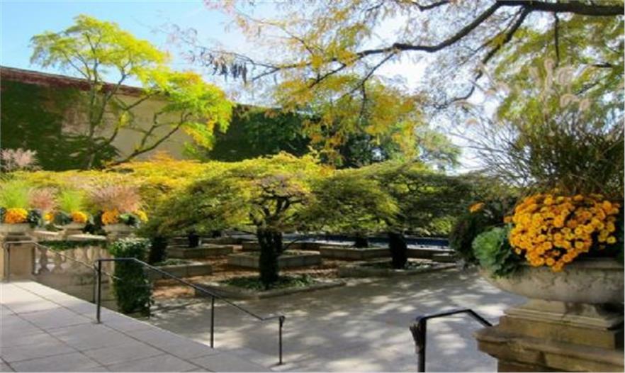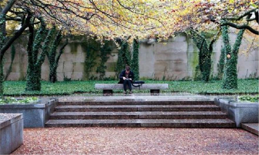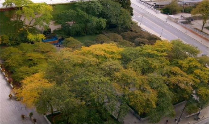 芝加哥藝術學院南園位于芝加哥密歇根大街和東杰克遜大道之間,每天有大量參觀藝術館的游客聚集于此休息。現(xiàn)狀場地是由藝術學院大樓和默頓大樓以90度圍合而成的矩形空間。為了與互成直角的兩座建筑協(xié)調(diào),在設計中凱利只運用了矩形一種幾何元素來設計花園平面,通過矩形大小的變換來調(diào)整空間大??;花園下面是大型停車場,使得花園不能種植深根性植物,為了增加種植土厚度,最終采用了種植壇設計方式。整個花園高度略低于街道,中部是兩個矩形樹壇組成的林蔭空間,夾在中間的一個矩形水池中有數(shù)排小噴泉,高度變化不定;花園簡潔的花崗巖鋪裝與四周的建筑墻面融為一體,為了舒緩四周建筑高大墻壁帶來的壓迫感,樹壇中種植了枝形舒展的山楂樹。寬大的水泥種植壇亦可作為游人的座椅;樹壇中還種植著各種花草,春季是風信子,夏季是天竺葵,秋季是菊花,冬季則是長青藤,花草顏色的變化使空間極為活潑;緊鄰默頓大樓的東側(cè)中央也是—個矩形水池,上面有一座古典雕塑;花園臨街的兩側(cè)都規(guī)則種植了兩排喬木,使花園空間內(nèi)外有別,并引導游客從喧鬧的街道逐漸進入較為安靜花園中。