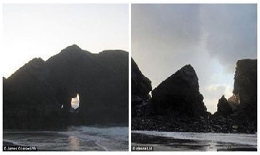 據(jù)悉該巨型巖石已在當(dāng)?shù)匾倭⒍鄠€世紀(jì),此前(左)是當(dāng)?shù)氐臉?biāo)志性景觀,但經(jīng)過風(fēng)浪之后,卻被硬生生削去一半(右)。
