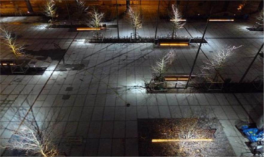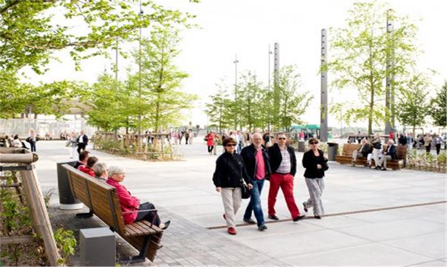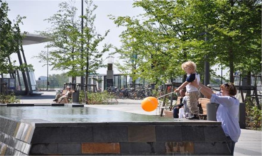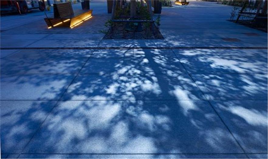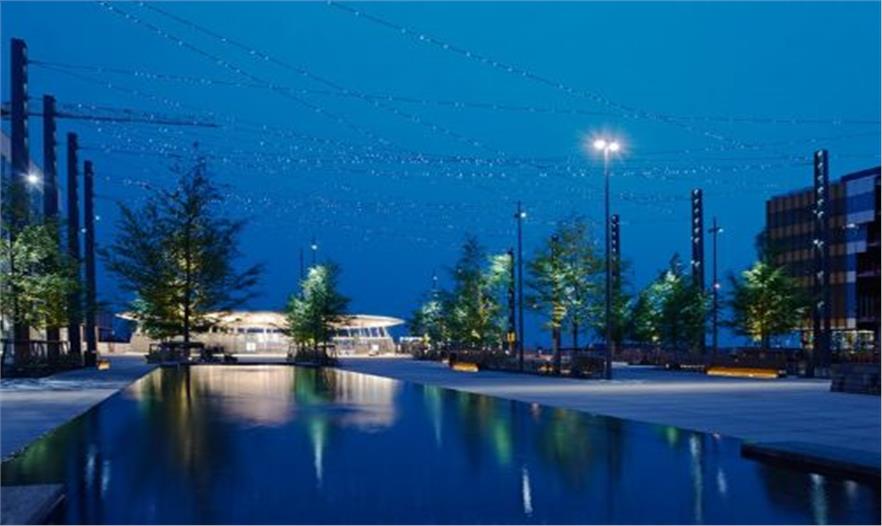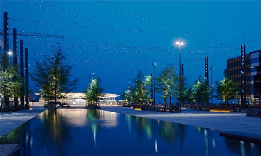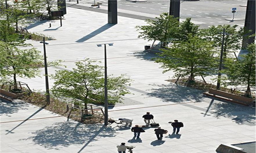 Hyllie廣場是一個(gè)城市廣場。櫸樹在瑞典南部地區(qū)是很具有代表性的,廣場的設(shè)計(jì)是也是利用櫸樹森林創(chuàng)建一個(gè)現(xiàn)代化的聚會(huì)場所。設(shè)計(jì)師的想法是在廣場上建造一個(gè)山毛櫸林區(qū),山毛櫸是瑞典南部的特色景觀,全國只有此處氣候足夠溫和,適于其生長。由于山毛櫸枯萎不會(huì)掉落的冬葉賦予了樹木一種溫暖的棕色,且具有“象腿一樣的樹干色澤”。而技術(shù)上也證明了該項(xiàng)目的高度技巧性:山毛櫸是都市中很難栽種的植物,因此必須在 2m × 1m大小的花崗巖路面下打造一層“結(jié)構(gòu)性土”。LED燈在新廣場上打造出熠熠星空,襯托出山毛櫸林的魔幻氛圍。星光閃耀,人造的月光從樹葉間灑落,投下一片陰影。