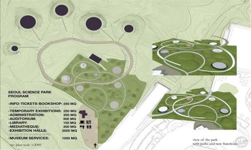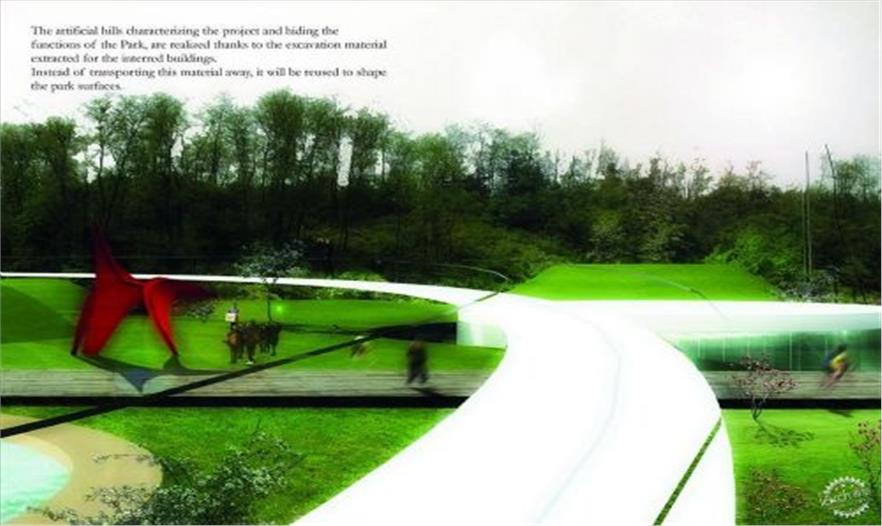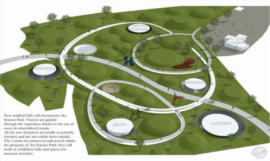 事實(shí)上,大部分現(xiàn)有的建筑將被保留并循環(huán)再利用:五個(gè)大罐子將成為展廳;辦公大樓將變成公園的大門,現(xiàn)有的車庫(kù)將作為一個(gè)帶屋頂?shù)墓部臻g用來(lái)休憩。同時(shí),假山下掩藏著功能空間也作為本項(xiàng)目一特色,采用構(gòu)建時(shí)挖掘的土壤進(jìn)行堆砌避免從其他地方運(yùn)送材料,從時(shí)間和成本上都大大節(jié)省了造價(jià)。