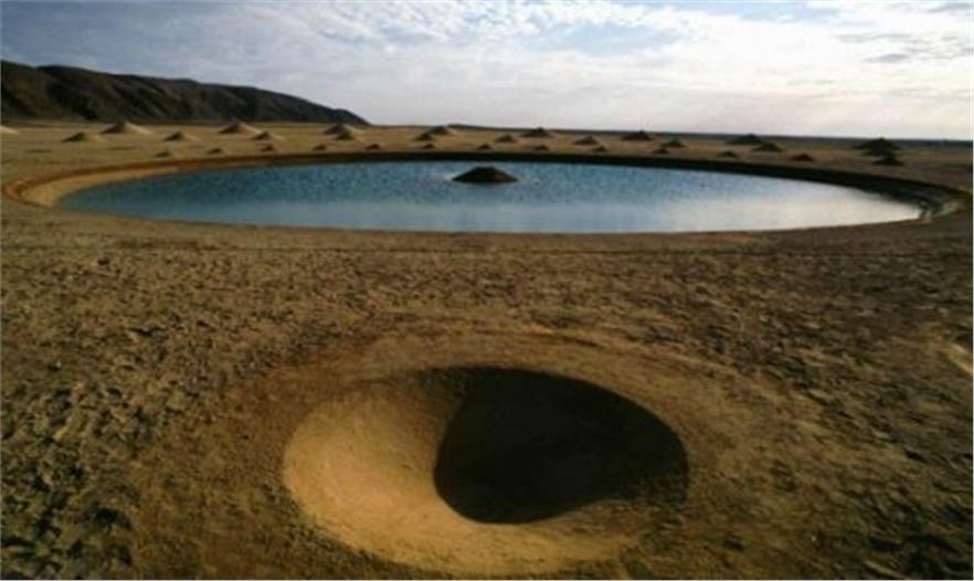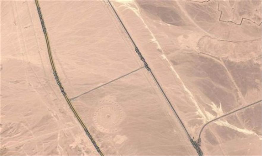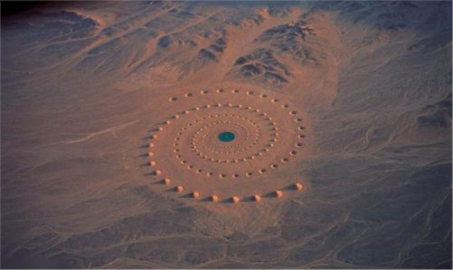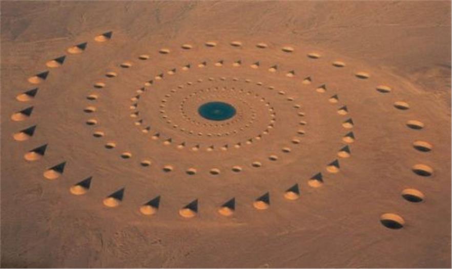 據(jù)了解,這一奇景出自三名藝術(shù)家之手。他們設計并親手建造了這個占地100萬平方英尺(約合9.3萬平方米)的龐大藝術(shù)作品,并將其命名為“沙漠的呼吸”。它有兩個連鎖螺旋相扣,其中一個有垂直錐,另一個在沙漠面形成錐形洼地。起初,他們還在內(nèi)部打造了一個小小的中心湖,但是最近的谷歌地圖顯示,湖水已經(jīng)干涸。