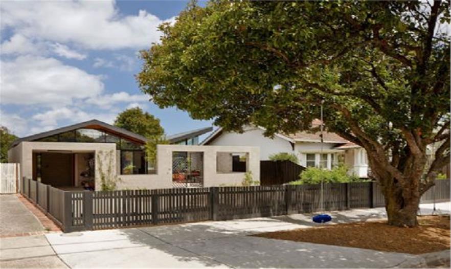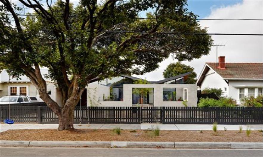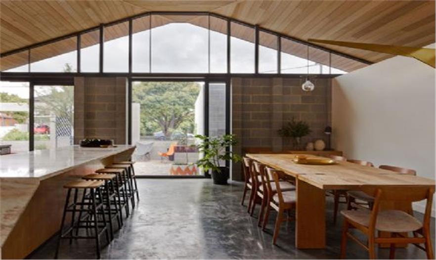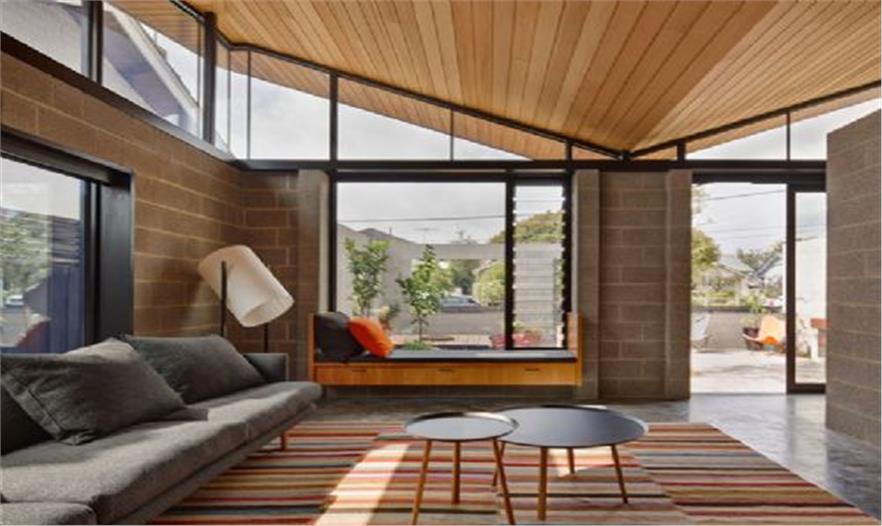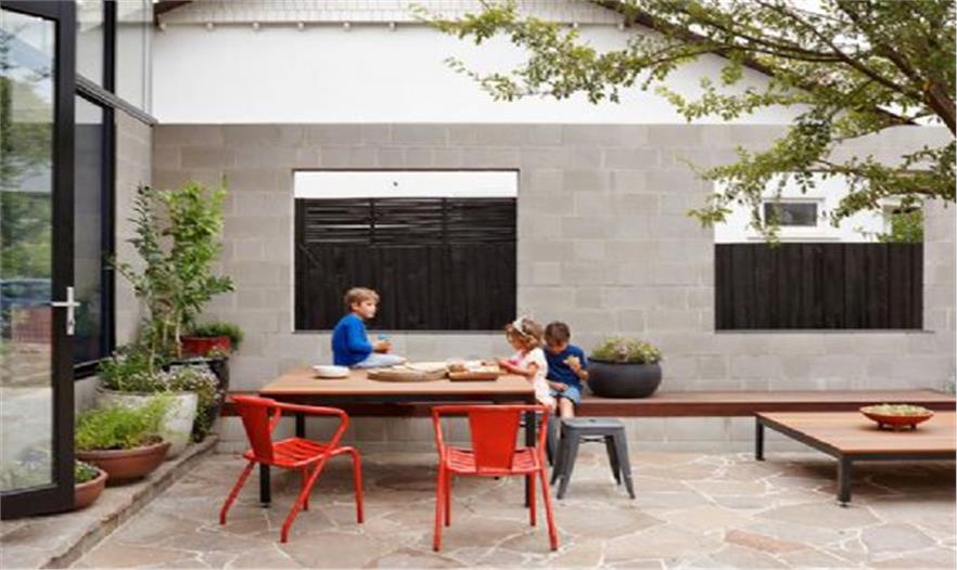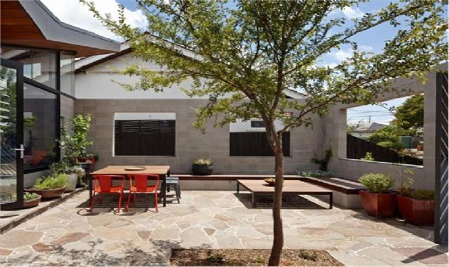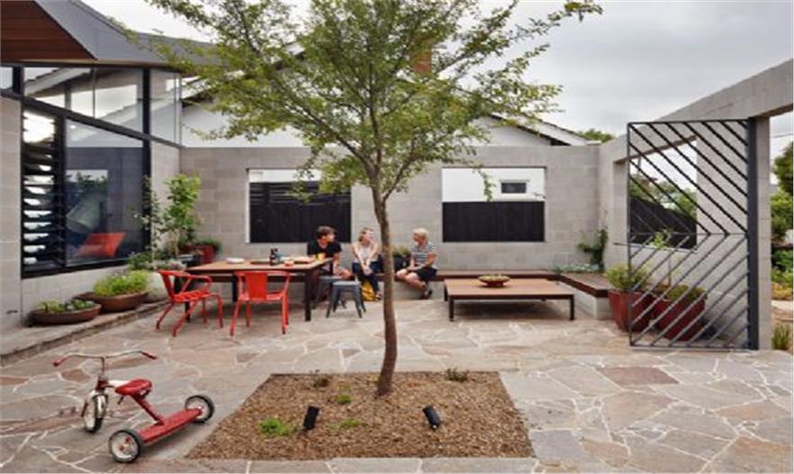 費(fèi)爾菲爾德莊園式住宅 Fairfield Hacienda house 由MRTN Architects 工作室設(shè)計(jì)。建筑向后退出三分之一的位置,這樣就有了很大的前庭院,在此基礎(chǔ)上,建筑師又將院落的一部分用混凝土墻圍合,墻上摳開了許多窗子一樣的洞口,內(nèi)部用硬質(zhì)石材鋪地,同時(shí)安置了座椅和桌子,將這里變成了一處愜意的露天客廳。天氣好的時(shí)候,一家人在此其樂融融~
