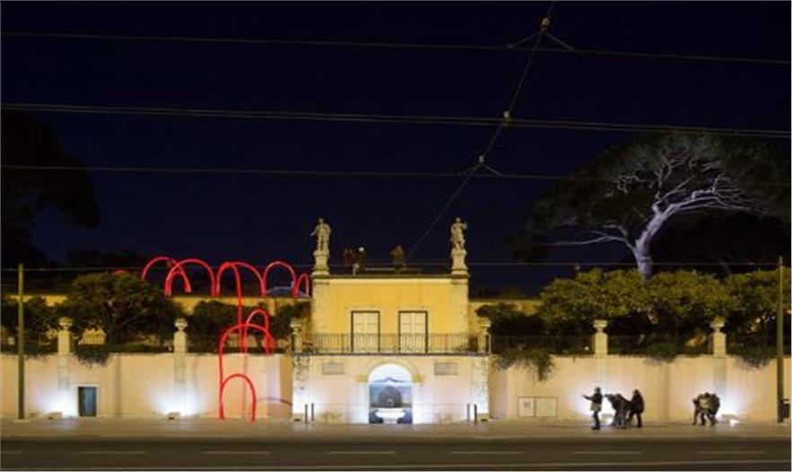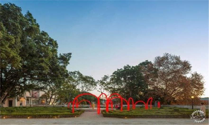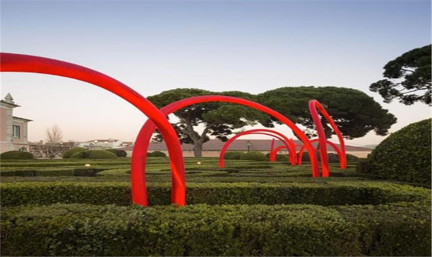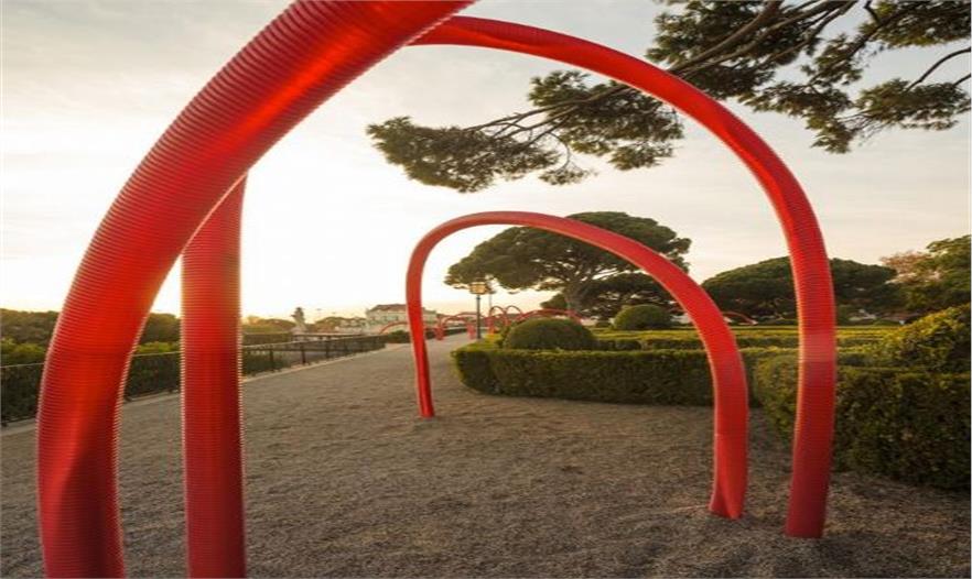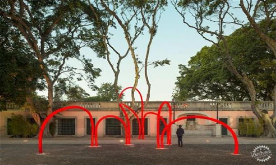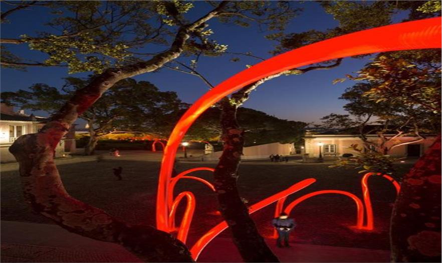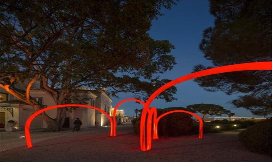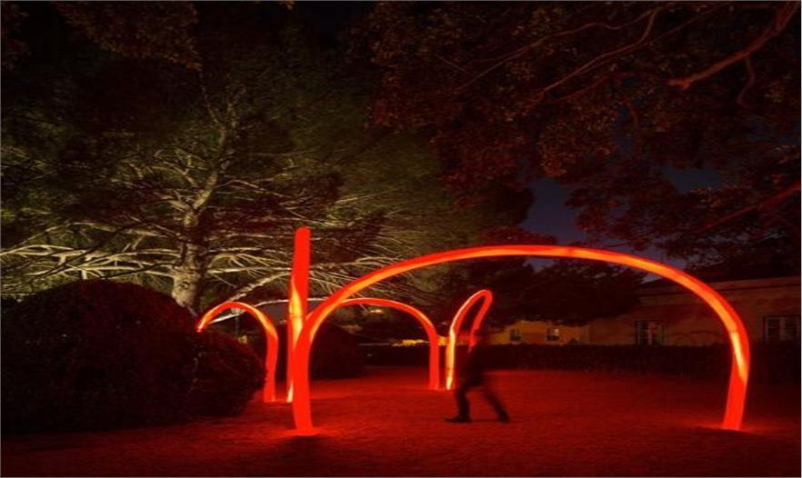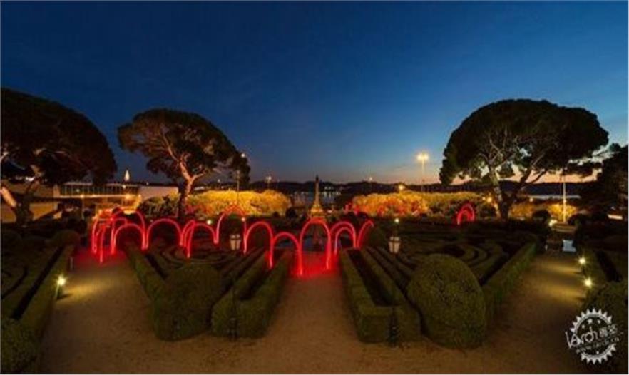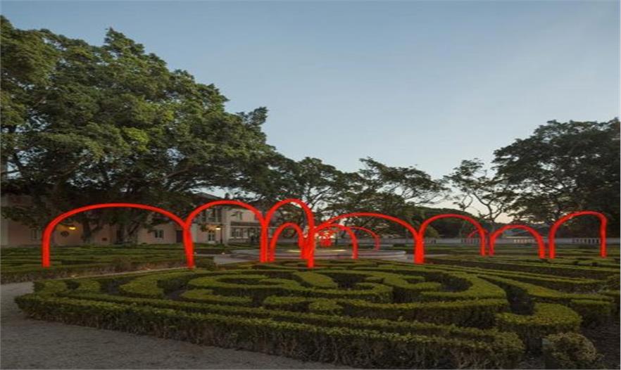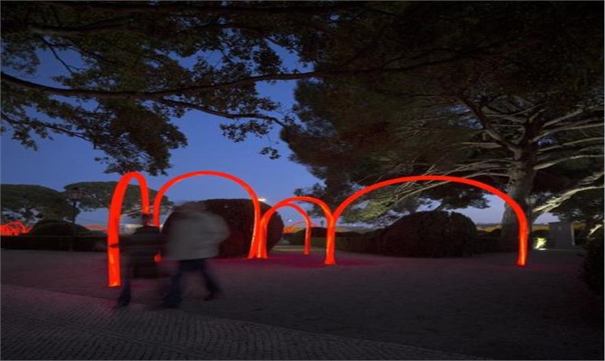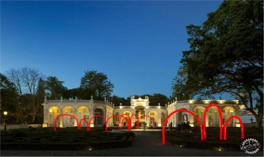 這項(xiàng)工程是在2013年12月和2014年1月進(jìn)行的,所以這些拱門的紅顏色不但給圣誕節(jié)增添了節(jié)日的氛圍,也映襯了園林內(nèi)的綠色植物。今年年初,葡萄牙宮殿外的灌木叢、道路、圍墻和噴泉處多了許多紅色拱門,這是Porto studio LIKEarchitects設(shè)計(jì)事務(wù)所特意安裝的。經(jīng)過LIKEarchitects設(shè)計(jì)事務(wù)所長達(dá)一個(gè)月的努力,許多修長的拱門出現(xiàn)在人們的視野中,這些拱門是由裝有LED燈的紅色波紋管組成的。這個(gè)裝飾了紅色拱門的宮殿就是昔日里斯本的葡萄牙總統(tǒng)府,現(xiàn)在是一座博物館,但是它的后花園還從來沒有向公眾開放過。這項(xiàng)工程正好處在這座宮殿作為總統(tǒng)博物館的特殊歷史時(shí)刻,所以游客漫步在這個(gè)總統(tǒng)花園時(shí),就能感受到一個(gè)奇妙的照明世界。