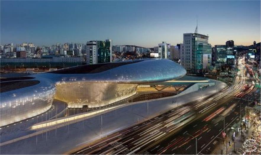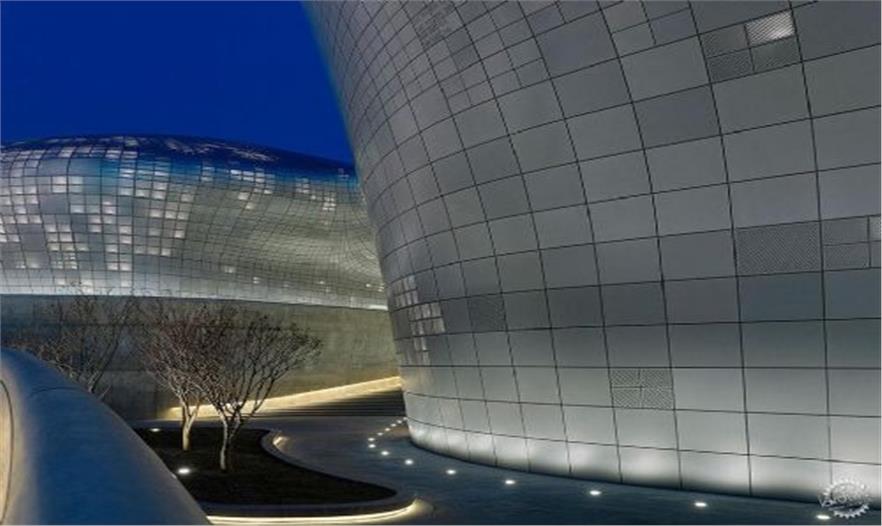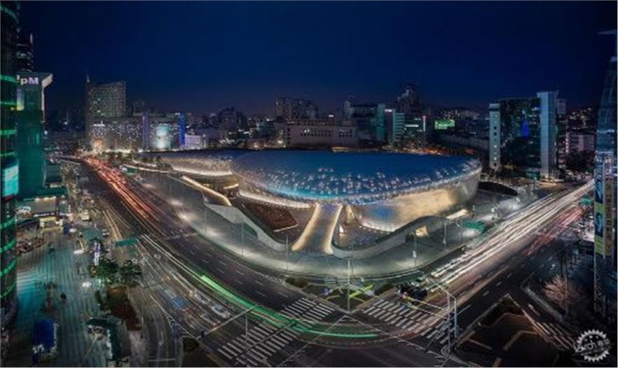 韓國(guó)首都首爾是一個(gè)活躍的24小時(shí)商業(yè)圈,建筑師扎哈•哈迪德在這里打造了一座38000平方米的世界上最大非標(biāo)準(zhǔn)建筑——首爾東大門設(shè)計(jì)廣場(chǎng)(首爾DDP),其主要特點(diǎn)是擁有使人聯(lián)想到飛碟的銀色曲面和燈光效果。