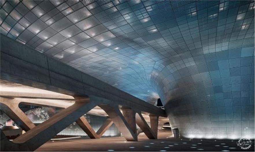 東大門設(shè)計(jì)廣場(chǎng)的結(jié)構(gòu)也非常壯觀。難以分出層來的各種空間重疊在一起。設(shè)計(jì)師把這座建筑稱為“實(shí)體動(dòng)畫和穿孔圖案的場(chǎng)地”,白天,光線透過空洞照射到背面,形成點(diǎn)點(diǎn)光斑,晚上柔和的燈光反射出來,營(yíng)造“生命呼吸”的效果。