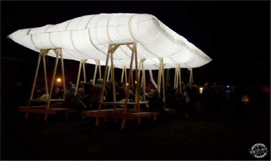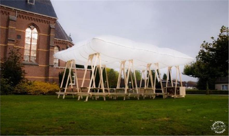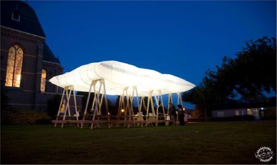屋頂在夜里會(huì)發(fā)光,為野餐者在爐子上烘烤食物帶來充足的光亮。荷蘭文“Het dak dat opgaat in rook”也就是“在煙霧中往上漂的屋頂”之意,這頂野餐棚就像煙霧般輕盈,隨著活動(dòng)的舉行可以四處搬遷、移動(dòng)。