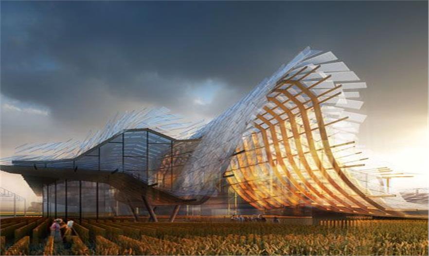 “希望的田野”中意喻中國廣袤的土地,隱喻中國古老的文明。展館充分吸收中國傳統(tǒng)建筑的結(jié)構(gòu)和形態(tài),結(jié)合現(xiàn)代技術(shù),形成具有強烈中國傳統(tǒng)建筑意向的中國館形象。屋頂采用具有中國象征意義的竹編材料覆蓋,大幅度降低了材料成本。在意大利燦爛陽光的照射下,將折射出金色的光芒。