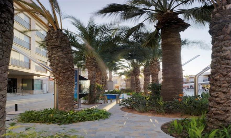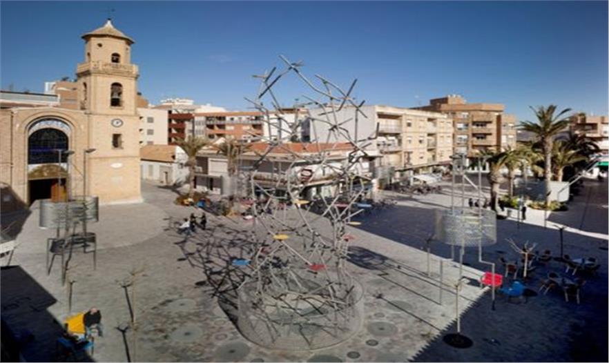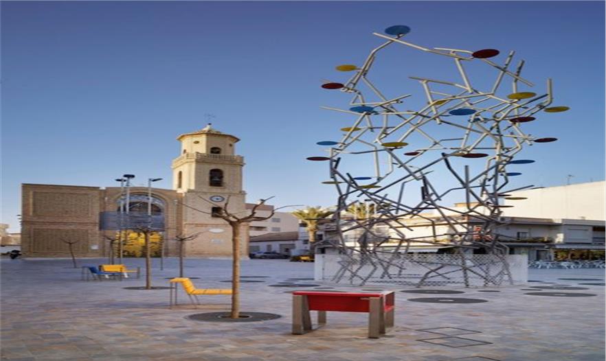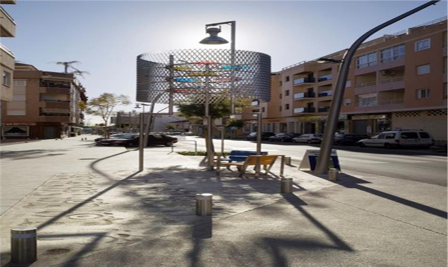 Pilar de la Horadada廣場坐落在西班牙東南部阿爾坎特市主街道上,臨海。廣場和周圍街道十分不規(guī)則,周圍多處擁有小公園和散落各處的樹木。建筑師在擁抱沙灘、棕櫚樹、椰樹的廣場上打造一個休憩和散步場所。