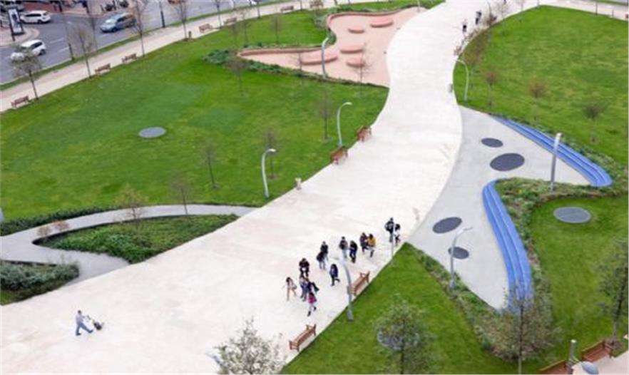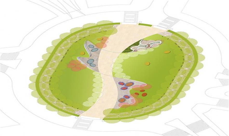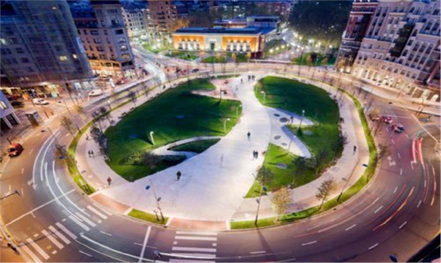 一條直接的核心路徑,是能量和城市運(yùn)動(dòng)的焦點(diǎn),傳遞至城市中的整個(gè)區(qū)域,連接起了各個(gè)部分。同時(shí),橢圓形環(huán)流貫通的道路兩旁綠樹成蔭,能夠讓人們更好地進(jìn)行流通以及更為休閑地靜坐小憩。三個(gè)公共的街心花園設(shè)置在中央道路的兩側(cè),其中俏皮地設(shè)置了用再生橡膠制成的座椅。每一個(gè)街心花園都具有不同的特性:一個(gè)是圓形劇場(chǎng)的部分,其中有著反射性水坑形成的座椅;一個(gè)是有著無背長(zhǎng)軟椅的區(qū)域,還有一個(gè)是“花園”區(qū)域,在入口選用了花灌木和100年生的Laegostremia樹。在廣場(chǎng)的北半部還有一個(gè)占地1000平米空間的地下停車場(chǎng)。