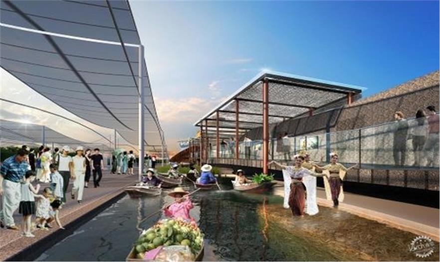 水資源對于泰國農(nóng)業(yè)起到了很大的作用,泰國館一直強調(diào)這一點。一進入泰國館的通道處,可以看到來自泰國神話傳說中的水蛇娜迦的生動描寫。這條通道將會帶領游客穿過一塊稻田,通過不同生長階段的水稻充分展示了泰國農(nóng)業(yè)的發(fā)展。