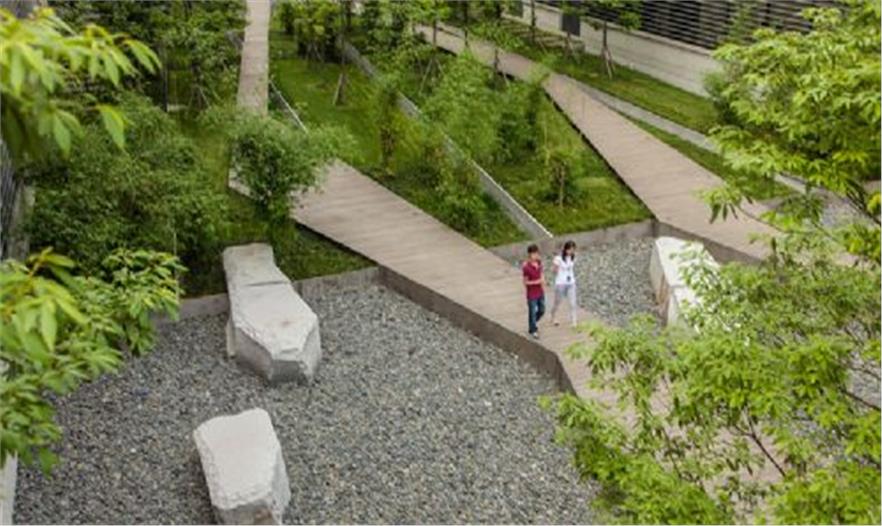 這個(gè)城市綠洲是賽門鐵克公司在成都的新產(chǎn)品研發(fā)分部。該區(qū)域曾經(jīng)是一片了無(wú)生氣的區(qū)域,設(shè)計(jì)師對(duì)這片區(qū)域進(jìn)行了景觀設(shè)計(jì)建造,復(fù)興了整個(gè)區(qū)域,將建造規(guī)劃與整個(gè)城市的大環(huán)境融合在一起。景觀設(shè)計(jì)形成了織錦似的景觀效果,將公司各個(gè)建筑相互聯(lián)系,并且形成了城市中的綠洲。該項(xiàng)目的設(shè)計(jì)中還融入了降水收集、轉(zhuǎn)移、過(guò)濾系統(tǒng),屋頂上建有綠色花園,形成了對(duì)環(huán)境極其敏感的區(qū)域。