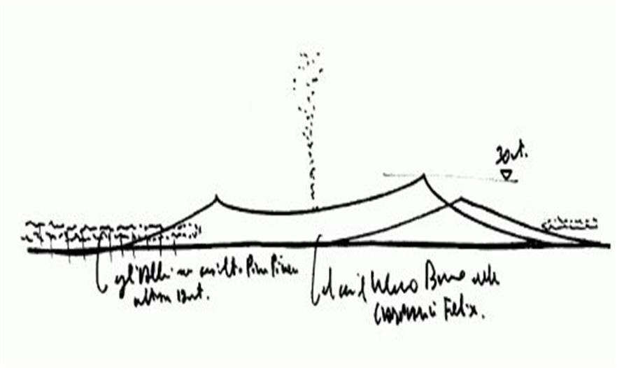 “火山口”綠色的建筑表皮類似地球表面的隆起,是本項(xiàng)目最明顯的構(gòu)造特征。復(fù)雜分層的結(jié)構(gòu)平鋪在建筑的結(jié)構(gòu)框架之上,起到隔熱,防滲并固定土壤的作用。這個(gè)綠色表皮就像一片懸掛的灌木,與周圍自然環(huán)境完美地融為一體。