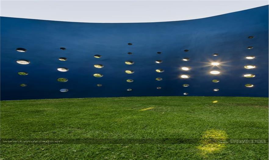在這兩面富于曲線美的墻之間,休閑區(qū)域、廁所、2個模擬單元和職員辦公室緊密地排列在一起。模擬單元所有垂直的拐角都只貼著邊界墻體出現(xiàn),這樣誰也不能從外面看到這些拐角。為了呈現(xiàn)“夜晚”的外表,整座建筑都粉刷成了午夜藍色。在整面曲線墻上,有策略地排布了一系列孔洞,從而創(chuàng)造出了堅實和空虛的對比。在白天,我們能夠穿過墻壁看到草地和樹木;而在夜間,照明光線從中穿過,就像星星一樣。