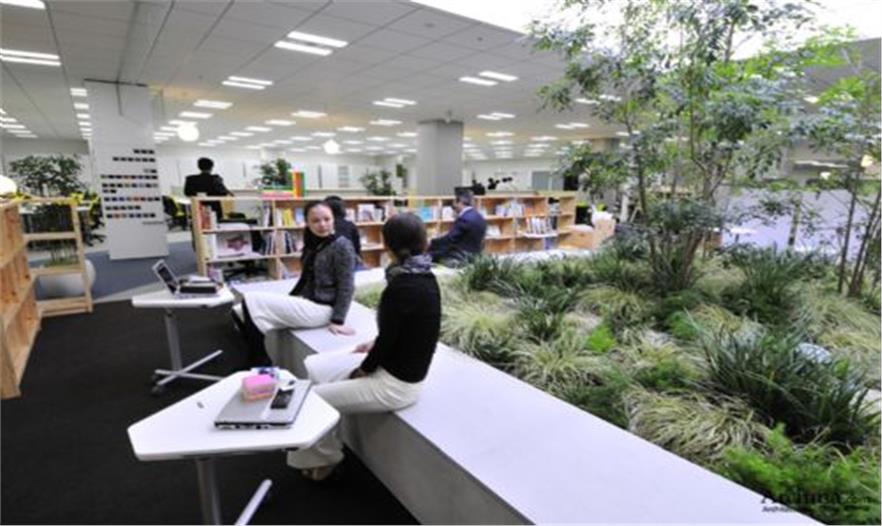 深處鋼筋水泥中的員工,早已渾然不覺外面是風(fēng)和日麗還是朦朧洗浴,也感受不到春風(fēng)的舒爽,夏日的熱浪,秋日的清爽和冬季的寒風(fēng),我們已經(jīng)習(xí)慣于在高樓中穿梭忘卻了大自然那最初的體驗(yàn)。然而在這里,KOKUYO東京品川辦公樓5F,能體驗(yàn)環(huán)保辦公的實(shí)驗(yàn)辦公室里,安裝自動感應(yīng)裝置的照明設(shè)備,根據(jù)屋外日光照度自動調(diào)節(jié)亮度呈現(xiàn)最自然的光;自動感應(yīng)外界溫度變化,可以自動開合的外窗、采用森林廢材制作的會議桌、通過落地窗,外面花園盡收眼底,在工作的同時,時刻感受大自然的四季變化,在一年四季中與大自然融合。