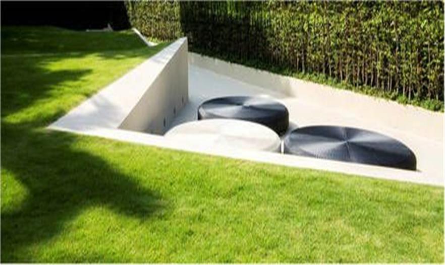 草坪山丘底部的沙灘。沙子能夠使水快速通過,滲透進(jìn)下面的儲(chǔ)水箱。
