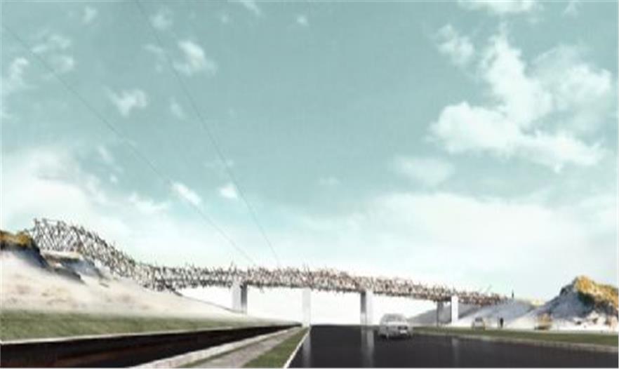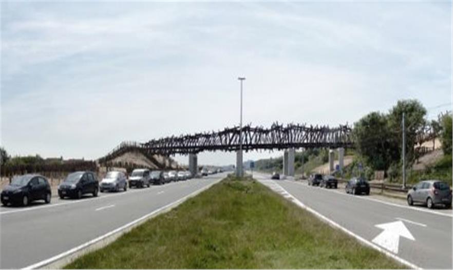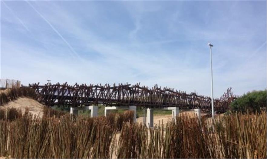 在2014年3月,混凝土橋框架的括號(hào)基組部分被安裝。今天,它由超過100立方米FSC標(biāo)記熱帶硬木和近30萬噸鋼橫梁組合完成了。