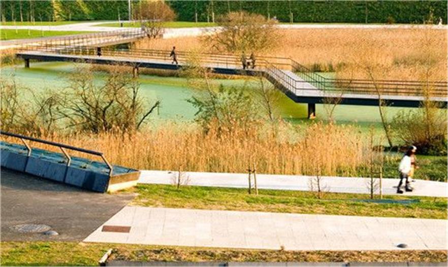 項(xiàng)目的最后一個(gè)方面是植物。這個(gè)公園重現(xiàn)的大西洋形狀使得蘆葦區(qū)域保留在中心,并且形成了人工湖,這里特殊的水質(zhì)十分適合蘆葦生長(zhǎng)。其余部分的植物種植能夠突顯周?chē)臻g,強(qiáng)調(diào)公園結(jié)構(gòu)線(xiàn)。每條結(jié)構(gòu)線(xiàn)上的植物都修剪出了不同的高度,并且根據(jù)供水量調(diào)節(jié)了疏密程度。