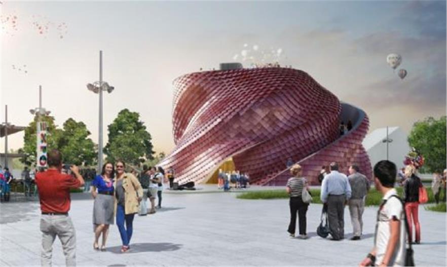 萬科館緊鄰阿瑞娜湖,1000平方米的展館像是從東方升起來的,形成了一個動態(tài)的垂直景觀。其內(nèi)外部間的音樂比例、彎曲的幾何形狀及流行感創(chuàng)造出一段時間和空間的旅程。紅色蛇紋雕刻形式盤旋而上,中間一個大樓梯身著白色的馬賽克瓷磚。站在頂部的屋頂觀測臺可以欣賞湖水和附近意大利館的美景。該展館外面鑲嵌著創(chuàng)新的三維紅色金屬化瓷磚,這是丹尼爾•里伯斯金和意大利CasalgrandePadana公司精心設(shè)計完成的。這種幾何陶瓷面板不但創(chuàng)造一個新穎的表達模式,而且他們擁有高度可持續(xù)的自清潔和空氣凈化性能。