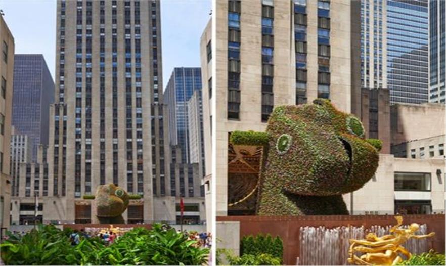 jeff koons的“恐龍木馬”已經(jīng)駕臨紐約,傲然屹立在曼哈頓區(qū)世界著名的洛克菲勒廣場,供市民參觀。由高古軒畫廊提供,公共藝術(shù)基金會(huì)和鐵獅門共同組織呈現(xiàn),這件巨型花卉雕塑高37英尺,俯視著閃亮的普羅米修斯塑像和城市景觀。這件一半是馬、一半是恐龍的雕塑由5萬株花卉組成。